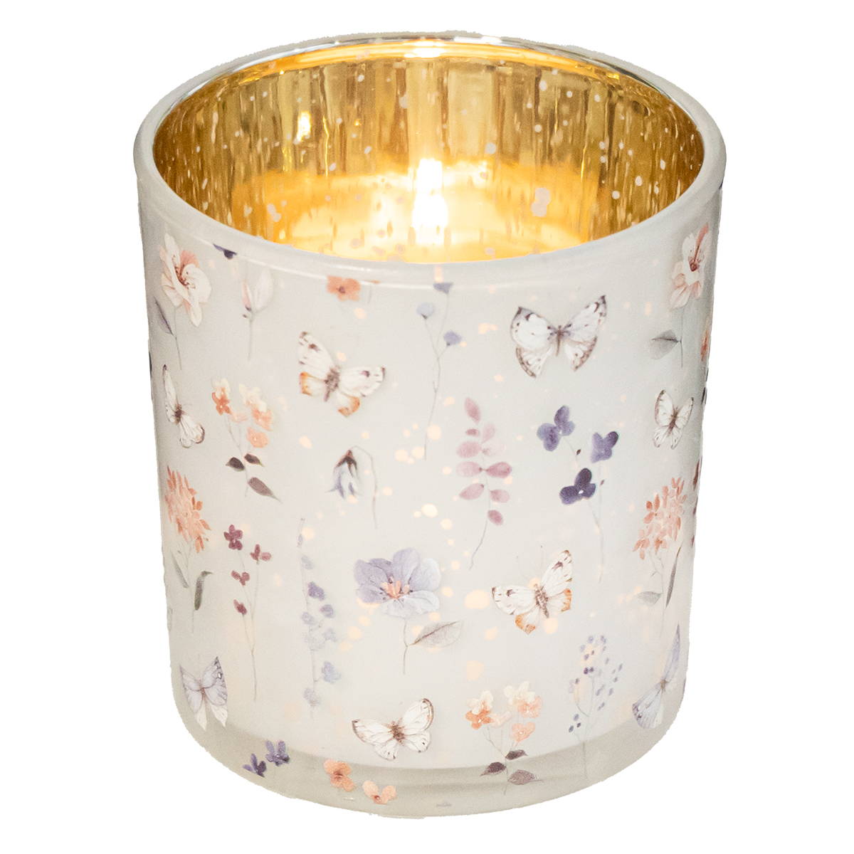 Dieses Windlicht ist ein echter Blickfang. Mit einer Höhe von 8 cm und einem Durchmesser von 7 cm hat es genau die richtige Größe, um sanftes Licht zu verströmen, ohne aufdringlich zu wirken. Das zarte Schmetterlingsmotiv auf Glas in Verbindung mit der innenliegenden silbernen Reflexionsfläche erzeugt ein zauberhaftes Spiel aus Licht und Schatten, wenn eine Kerze im Inneren leuchtet. Es verleiht so Räumen und auch Außenbereichen einen Hauch von Eleganz.