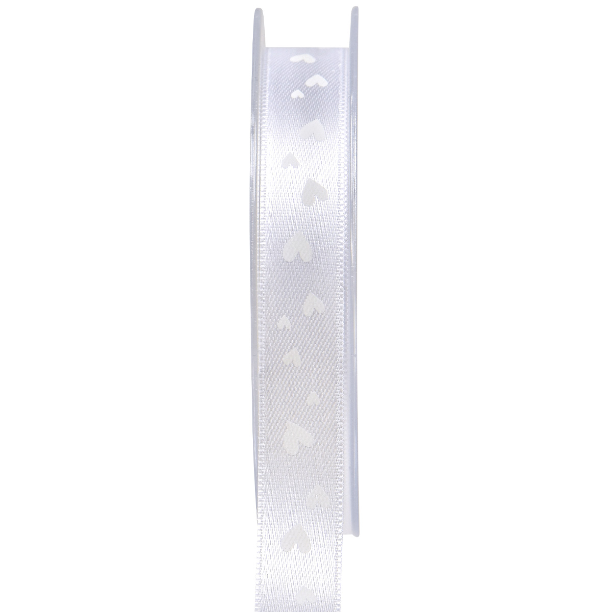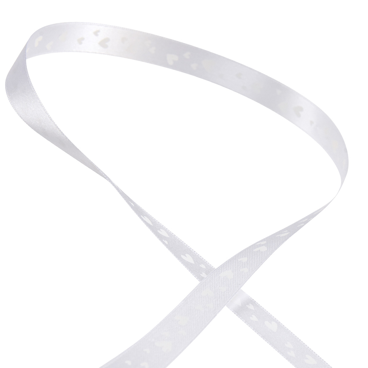 Das Polyesterband glänzt seidig weiß und ist romantisch mit weißen Herzen bedruckt. Webkanten schließen das Dekoband ab und geben ihm zusätzliche Stabilität.