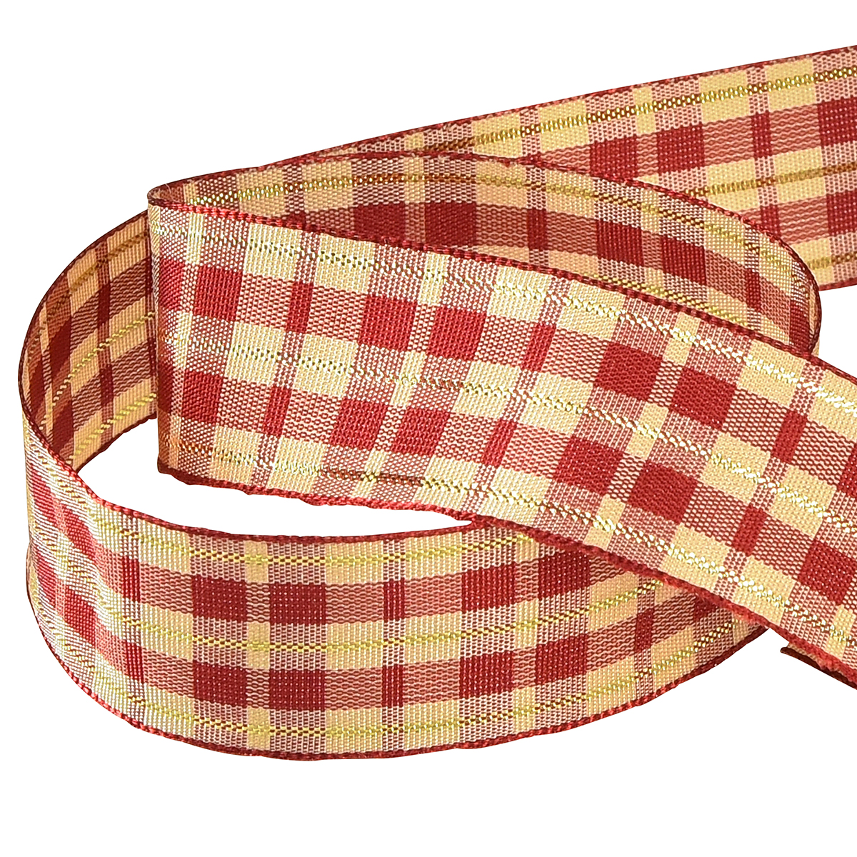 Bereichern Sie Ihre Dekorationsartikel mit einem Hauch von Eleganz und Tradition. Unser Karoband ist inspiriert vom klassischen Landhausstil und bietet durch seine harmonische Farbkombination aus Rot, Beige und Gold endlose Gestaltungsmöglichkeiten für Bastelfreunde, Dekorateure und Floristen.