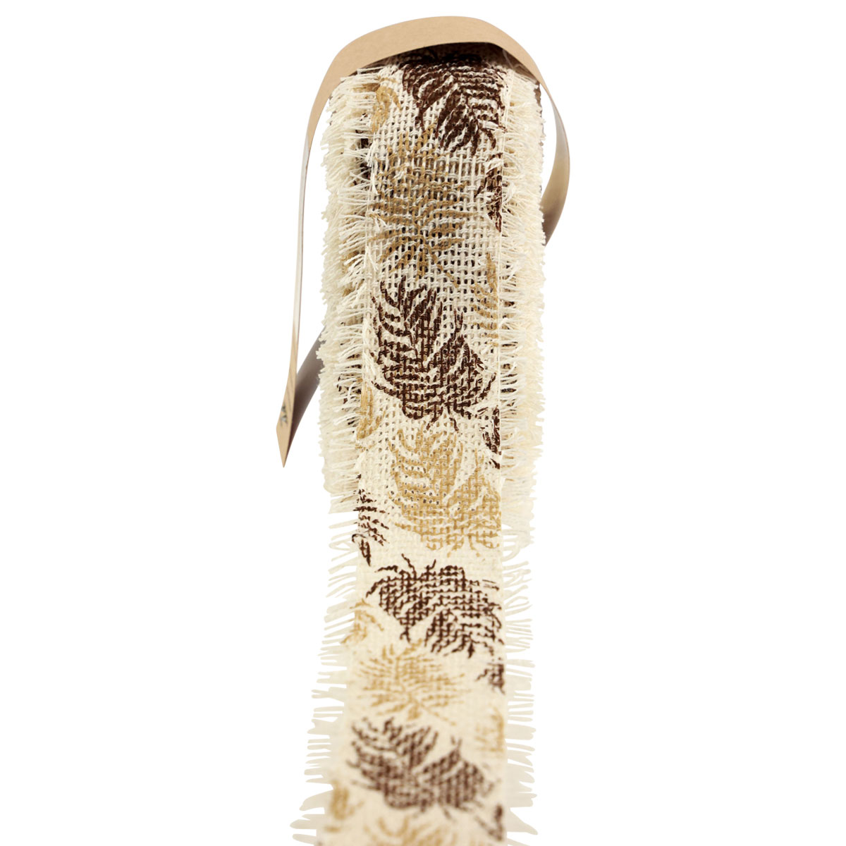 Die zarte, cremefarbene Baumwolle dieses Stoffbands zieren gefiederte Blätter, die ein Muster in Braun und Beige bilden. Mit den Fransen wirkt das Gitterband schön lässig und bringt eine entspannte, natürliche Stimmung in Ihre Dekorationen.