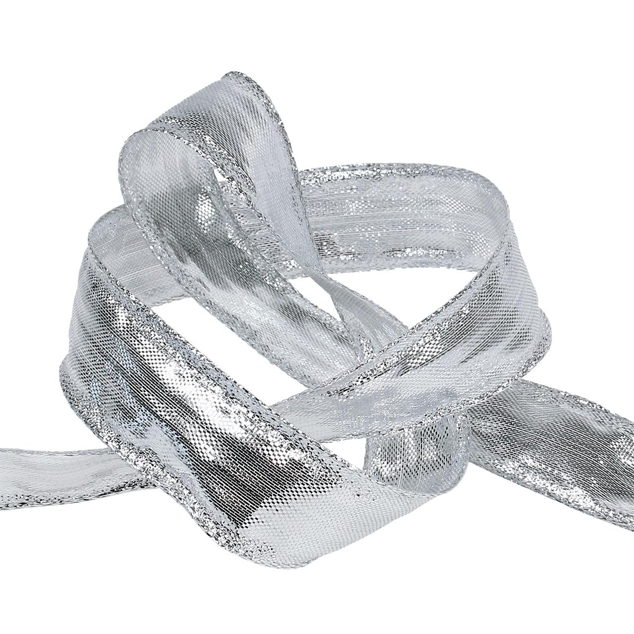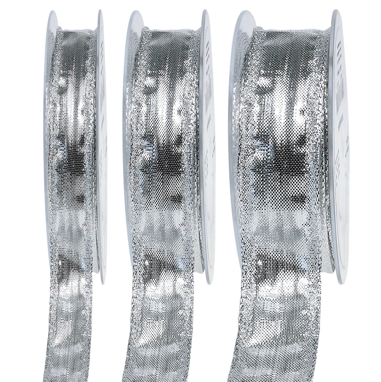 Nutzen Sie dieses feine Dekoband in Silber mit Drahtkante, das über den Reiter oben rechts in unterschiedlichen Breiten auswählbar ist, als edles Zierband zu festlichen Anlässen! Die Ränder, welche eine etwas andere Musterung aufweisen als die Mitte des Bands, sind mit biegsamem Draht versehen, sodass das Schleifenband in Ihren kreativen Projekten problemlos die von Ihnen gewünschte Form einnimmt und behält.