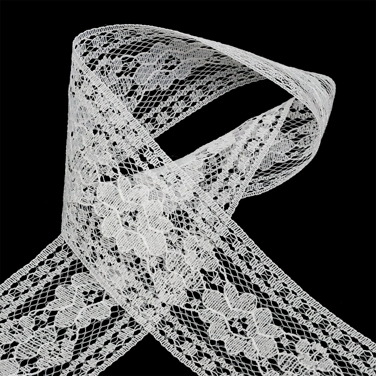 Das zu 100% aus Polyester bestehende Spitzen-Dekoband in Weiß misst in der Breite ungefähr 53 Millimeter und in der Länge circa 20 Meter. Sie erhalten es auf einer Spule aus Kunststoff, wo es von einer dünnen, silberfarbenen Nadel fixiert wird.