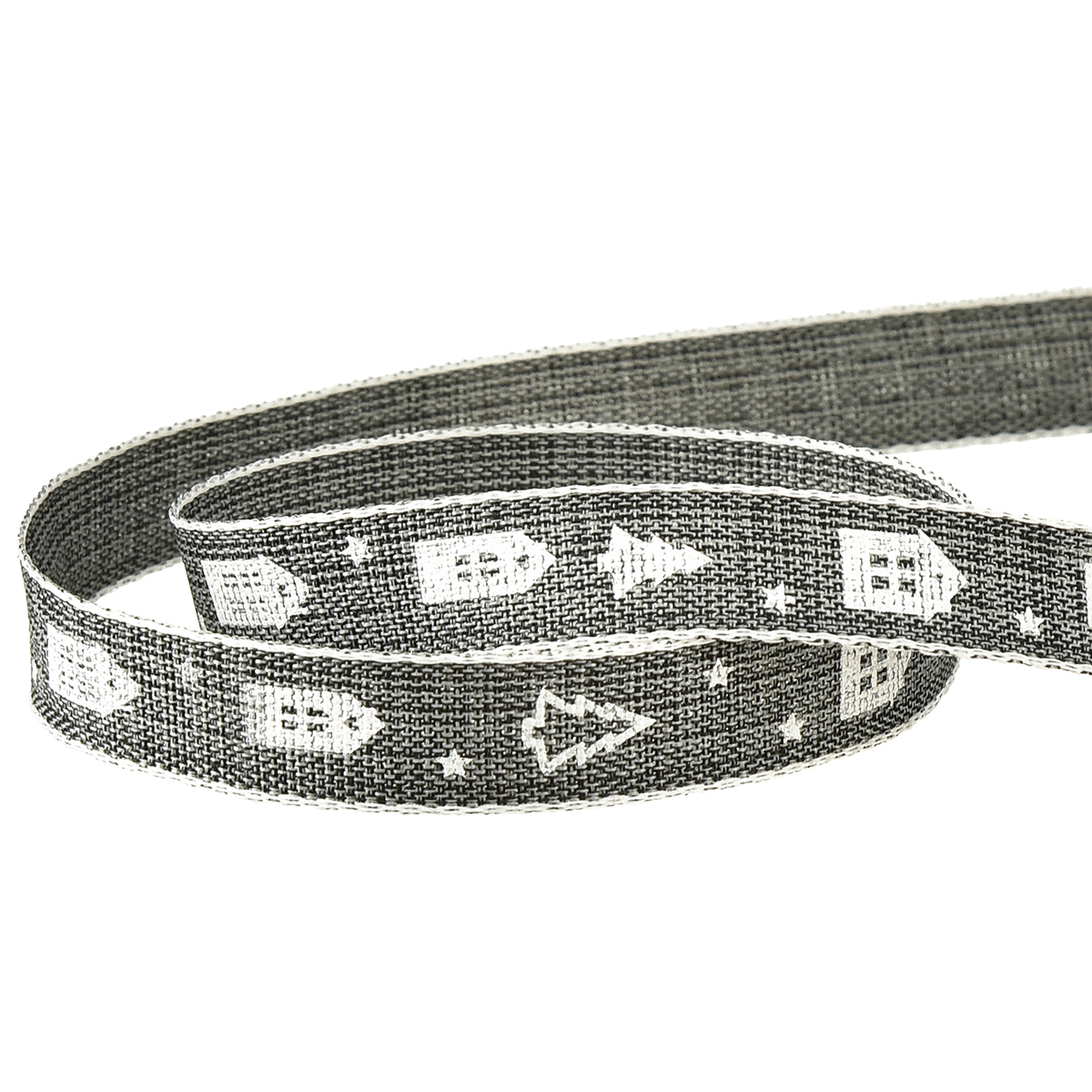 Produktname: Dekoband für Weihnachten Häuschen und Tannenbäume Anthrazit Weiß 15mm 20m