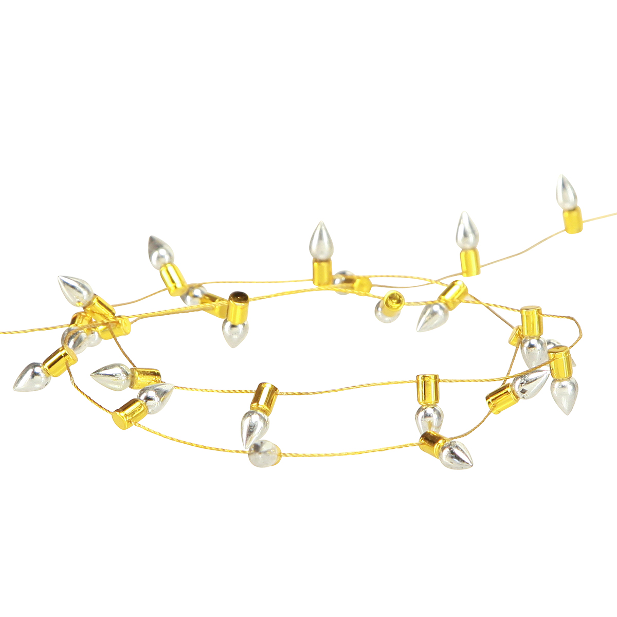 Unser Weihnachtsband mit Lichterketten-Motiv besticht durch seine Vielseitigkeit und Eleganz. Die Kombination aus goldener, schmaler Kordel und silbernen Deko-Lämpchen in Kerzenform machen dieses Schmuckband zu einem Highlight in Ihrer Weihnachtsdekoration. Mit einer Breite von etwa 12mm und einer Länge von etwa 5 Metern lässt es sich optimal in jede Deko integrieren.