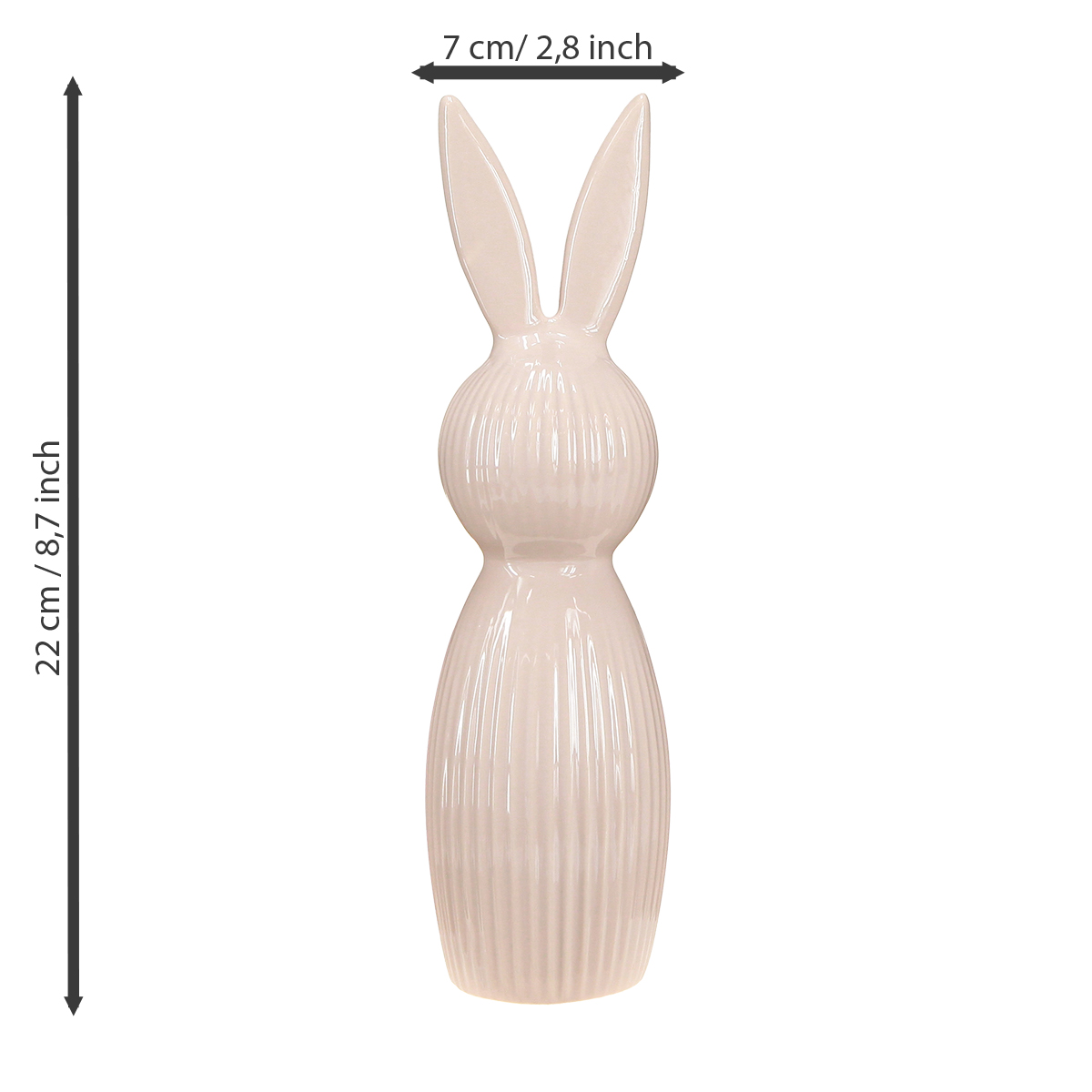 Ein Dekoobjekt, das Stil und Charme vereint: Der Keramik Hase ist 22 cm hoch und zieht mit seiner schlanken Silhouette und dem zarten Rosa die Blicke auf sich. Die feinen, vertikalen Rillen verleihen ihm eine schicke Struktur und bringen spielerisch etwas Bewegung ins Design. Mit einem Durchmesser von 7 cm ist er platzsparend und passt hervorragend selbst auf schmale Fensterbänke oder Regale. Das hochwertige Keramikmaterial überzeugt durch Solidität und Langlebigkeit – ideal, um auch in viel genutzten Bereichen wie dem Wohnzimmer oder Esszimmer immer eine gute Figur zu machen.