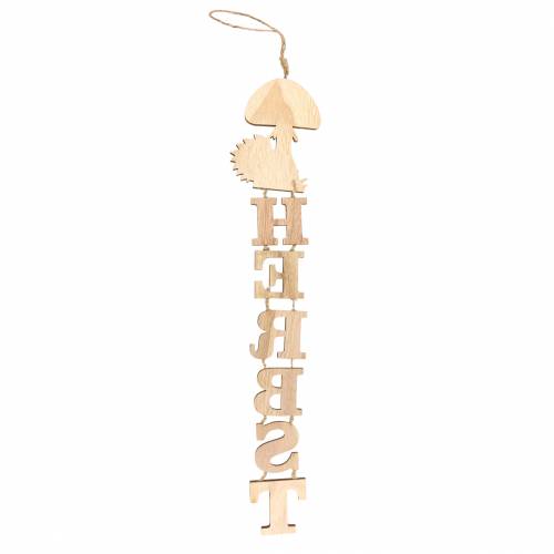 Die Elemente der Herbst-Deko zum Hängen sind vollständig aus Holz gefertigt. Die Farben sind in herbstlichen matten Naturtönen gehalten. Die Basis des Herbst-Anhängers bildet ein großer Fliegenpilz mit Igel. Unter der kleinen Herbstszene sind mit Juteband verbunden nach unten hin die Buchstaben des Wortes Herbst angebracht.