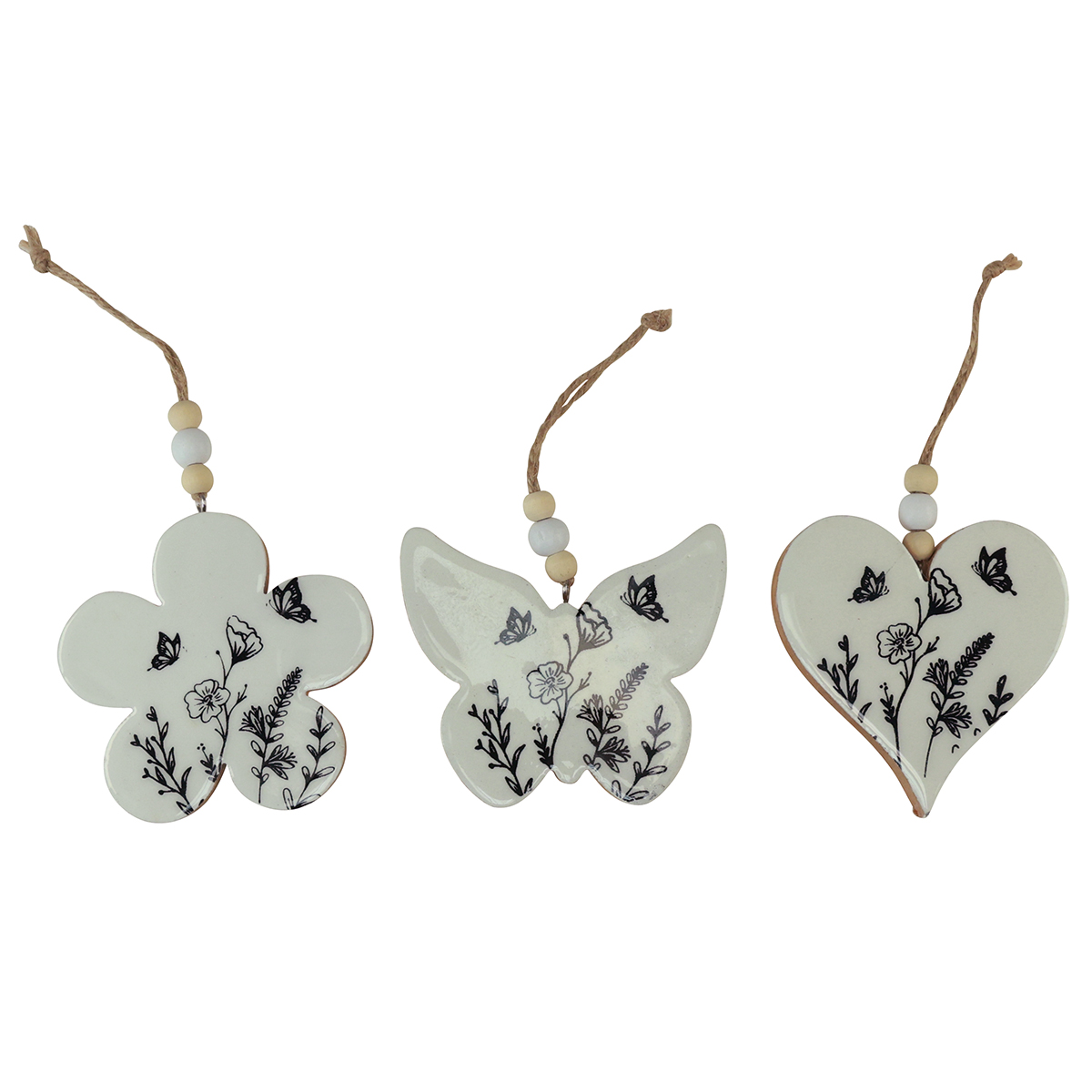 Die Anhänger aus Holz mit Juteschnur und Holzperle haben auf der Vorderseite eine weiß-glänzende Oberfläche, die an Porzellan erinnert. Die zarten Blüten und Schmetterlinge der dekorativen Anhänger sind liebevoll und detailgetreu in Schwarz gezeichnet.