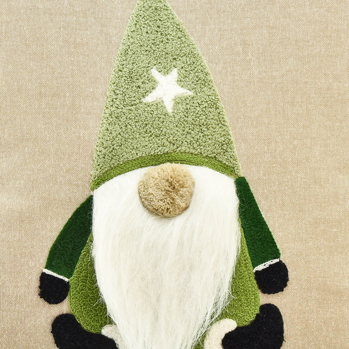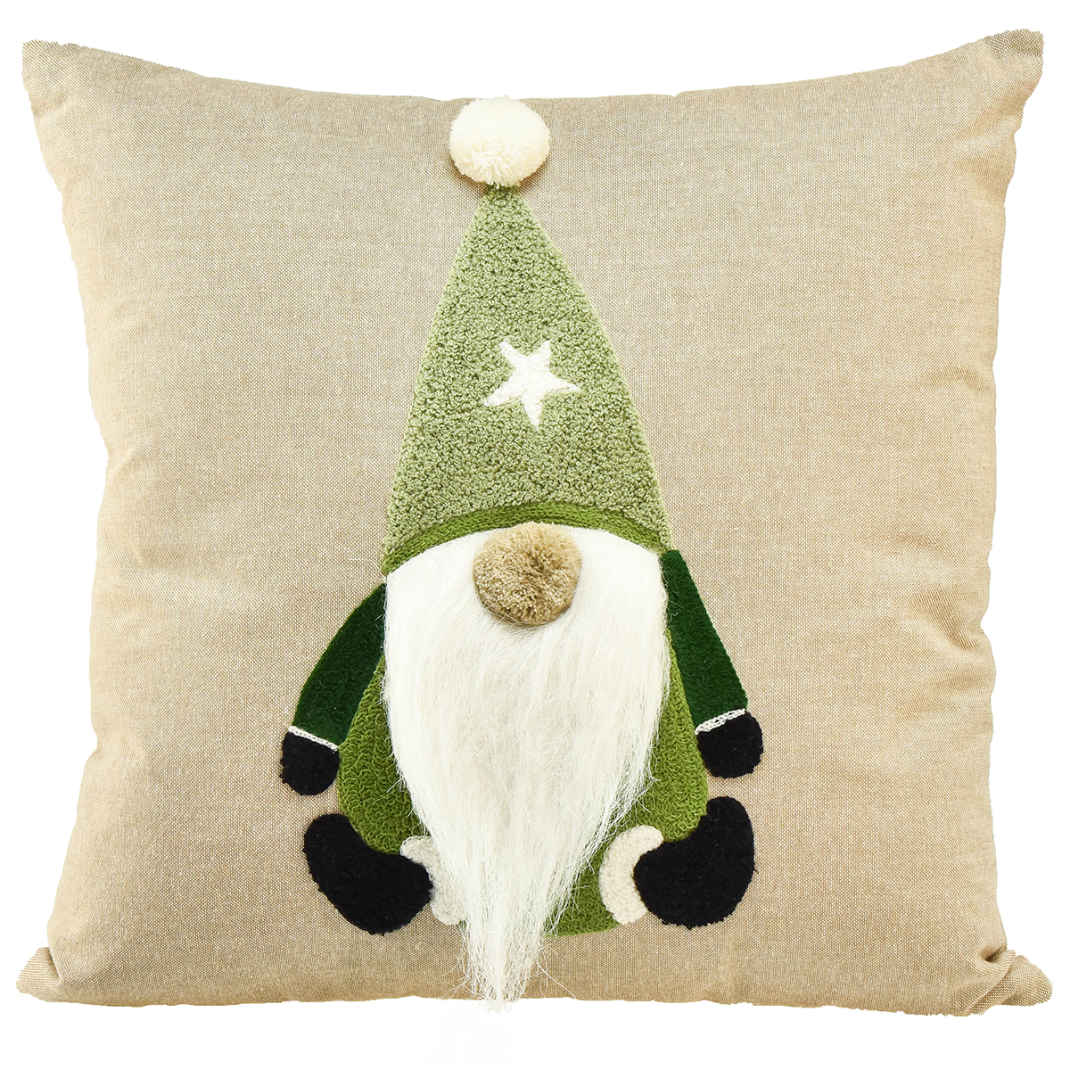 Entdecken Sie das charmante Dekokissen in Grün und Beige mit freundlichem Wichtel!