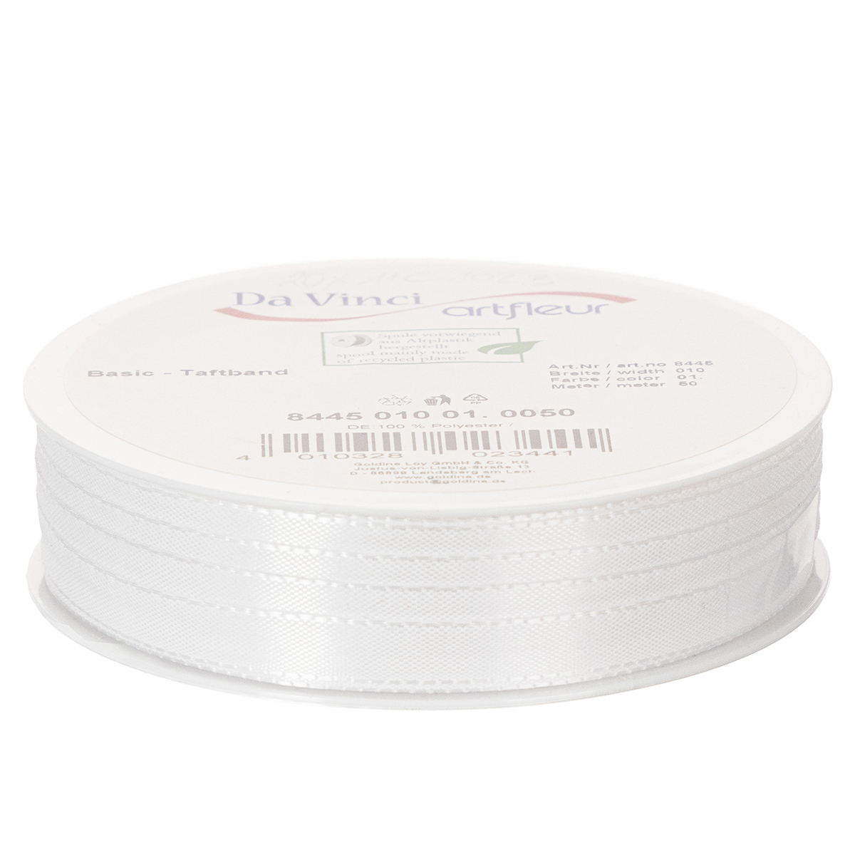 Das Dekorationsband in Weiß ist auf eine Rolle aus Kunststoff aufgewickelt und hat eine Länge von insgesamt 50 Metern bei einer Breite von 10 Millimetern.