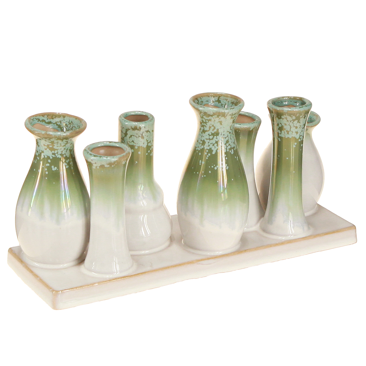 - Set aus 7 dekorativen Keramikvasen auf einem stabilen Tablett