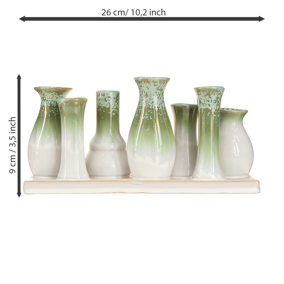 Wann haben Sie zuletzt Ihr Zuhause mit liebevollen Details bereichert, die das gewisse Etwas ausstrahlen? Unser dekoratives Keramikvasen-Set auf einem hochwertigen Tablett ist genau das richtige Wohnaccessoire! Diese wunderschönen Minivasen in sanften Grün- und Weißtönen vereinen Eleganz mit zeitloser Schlichtheit – perfekt für ein harmonisches Zuhause. Mit einer Länge von 26 cm und ihrer rustikalen Optik passen die Vasen in jeden Raum, sei es der Esstisch, die Fensterbank oder der Eingangsbereich.