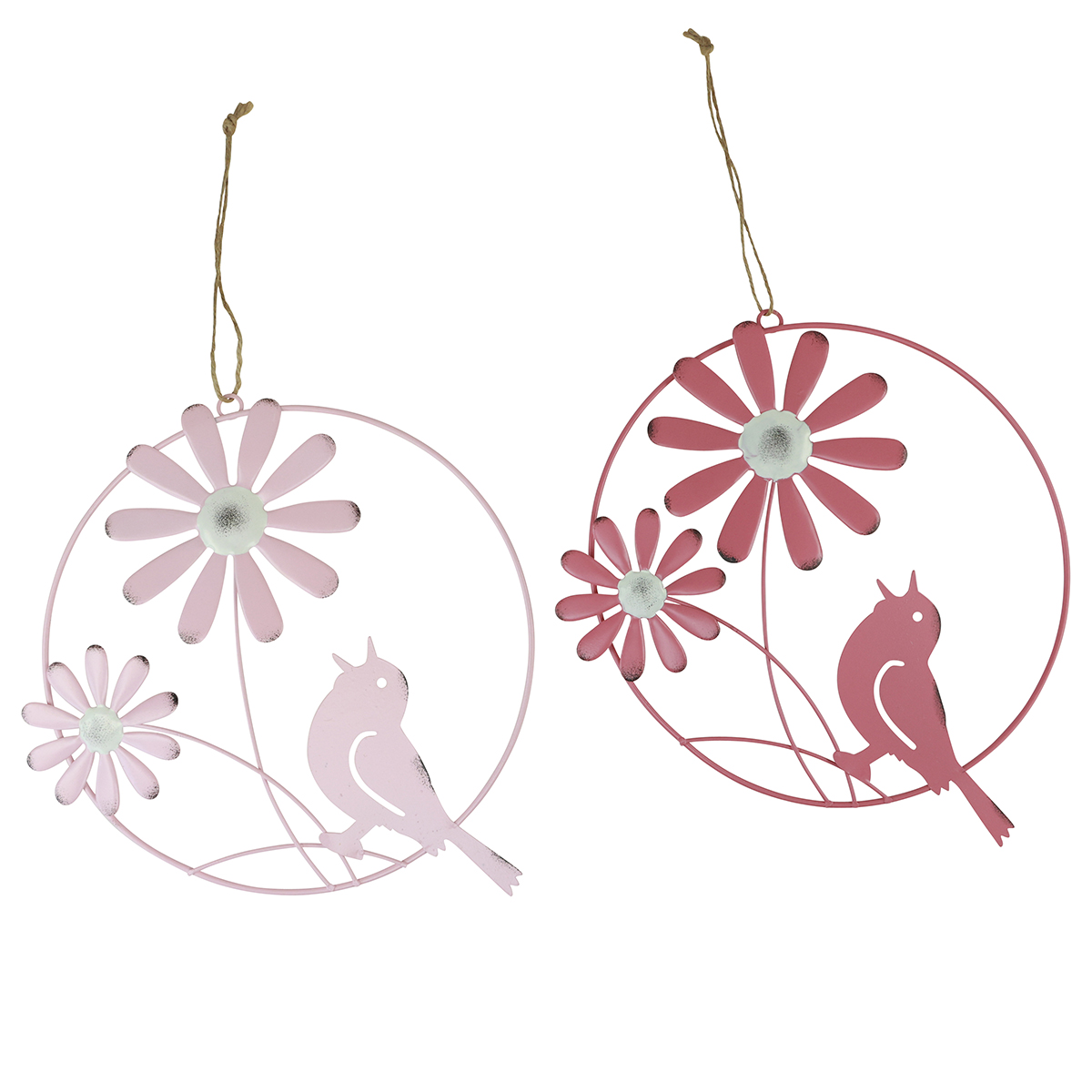 Sie erhalten die Blumendeko zum Hängen zweifach farblich sortiert im Set zu insgesamt 4 Stück. Im Set sind jeweils zwei Dekohänger in Pink und Rosa enthalten. Jeder der Loops mit Blumendekor ist vor allem an den Rändern optisch Braun angesprüht, was den Frühling-Anhängern einen leicht angerosteten Shabby Chic verleiht. Zudem ist jeder Loop Dekoring mit einer Jutekordel zum Hängen versehen.