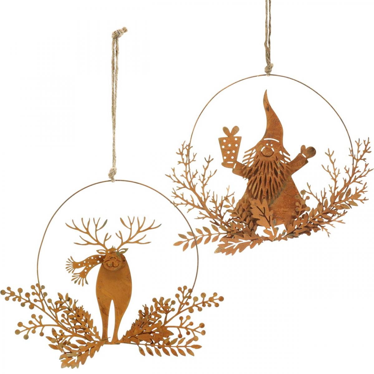 Dekoring für Weihnachten, Rentier im Ring, Weihnachtsmann mit Geschenk, Metalldeko Edelrost Ø18cm 2er-Set
