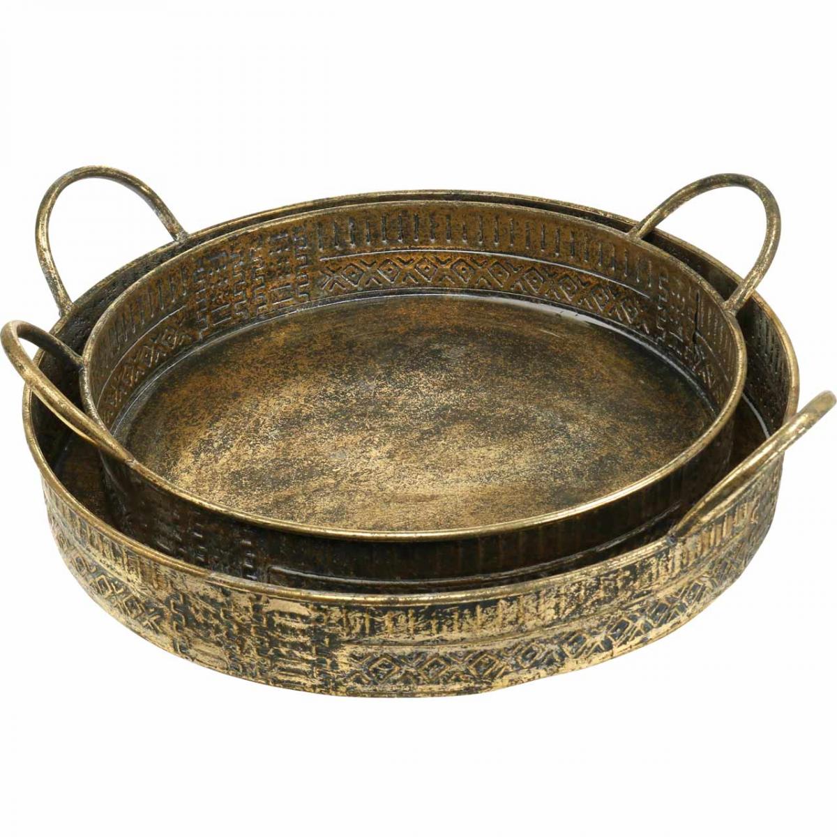 Dekoschale mit Griffen, Pflanztablett gemustert, Metallgefäß Golden, Antik-Optik B45,5/42cm Ø39,5/34cm 2er-Set