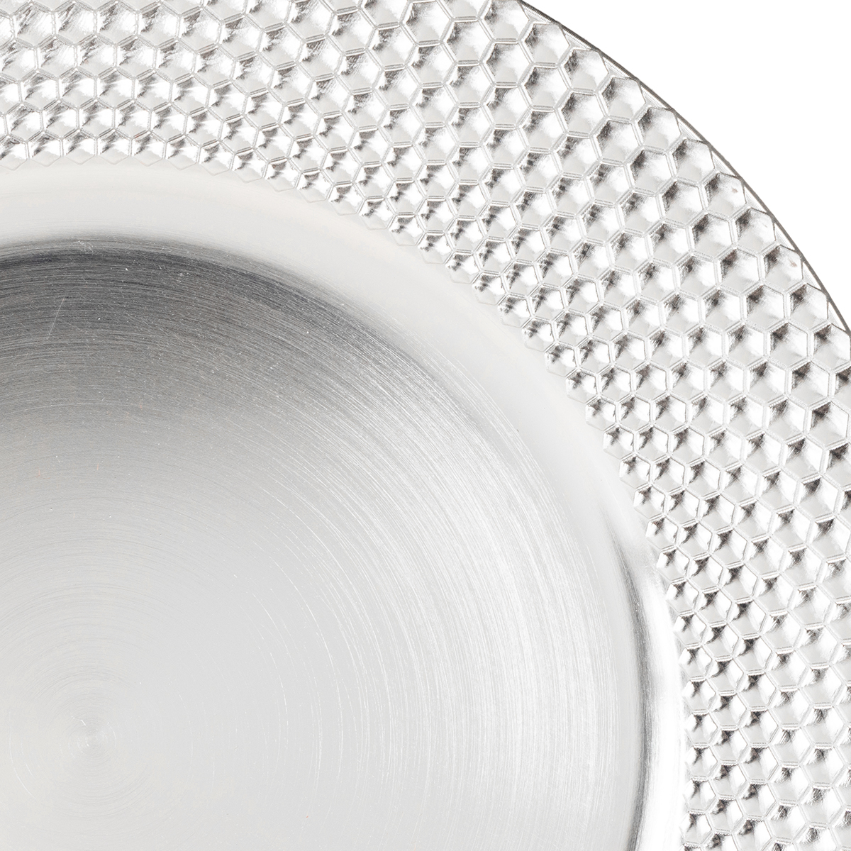 Doch es ist das Sechseck-Muster auf dem Rand, das den Teller zum Hingucker macht. Durch die Silberfarbe entfaltet der Dekoteller eine große Strahlkraft. Die Unterseite bleibt unbehandelt in Schwarz.