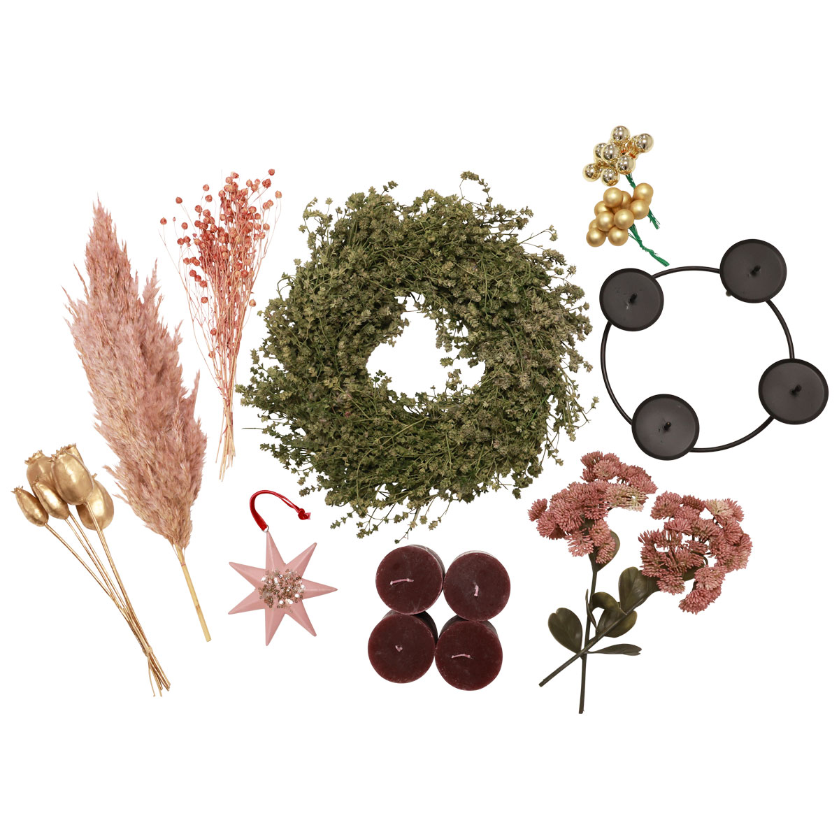 Flachs, Sedum und Pampasgras in zartem Rosa harmonieren wunderschön mit den burgunderroten Kerzen auf dem Kranz. Goldene Mohnkapseln fügen festliche Akzente hinzu und lassen den Trockenkranz im Advent noch festlicher erglänzen.