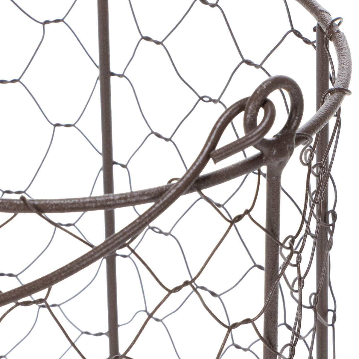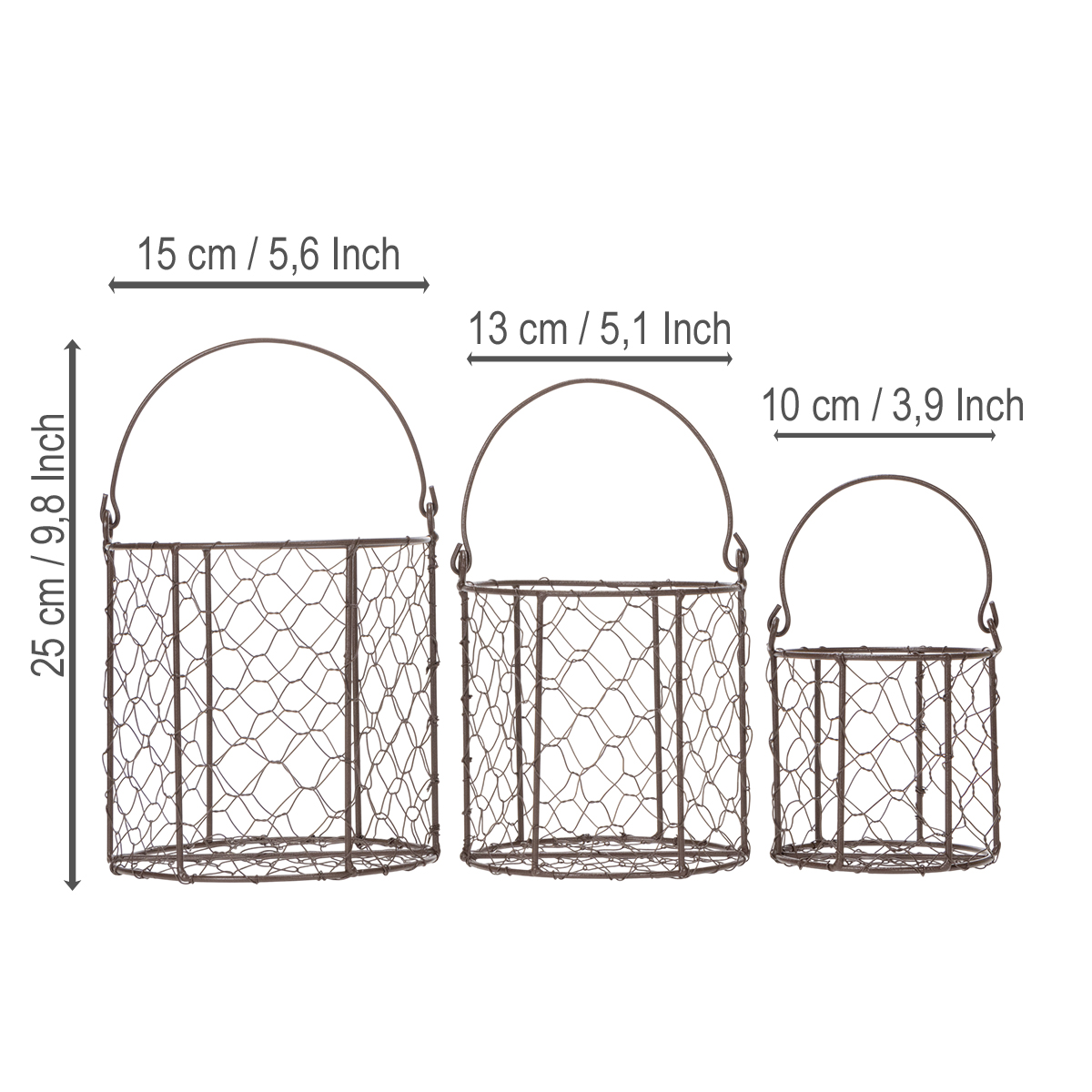 Dieses Set aus drei Drahtkörben überzeugt auf ganzer Linie. Gefertigt aus stabilem Metall und durch die feinen Maschen absolut belastbar, sind sie die ideale Ergänzung für den modernen Haushalt. Mit ihrem Durchmesser von 15 cm (großer Korb) und einer Höhe von 25 cm fangen sie praktisch alles auf, was Sie sortiert wissen möchten. Obst und Gemüse? Kein Problem. Küchenutensilien oder Stoffservietten? Perfekt. Oder mögen Sie es dekorativ? Pflanzenarrangements und Blumen entfalten in diesen Körben ihren besonderen Charme. Dank der runden Form und des stabilen Tragegriffs lassen sich die Körbe ganz unkompliziert von Raum zu Raum oder in den Garten tragen. Wer den Vintage-Stil liebt, wird hier auf Anhieb begeistert sein. Die braune Farbe sorgt dafür, dass sich das Set harmonisch in jede Einrichtung einfügt – vom skandinavischen Minimalismus bis hin zu rustikalem Landhausstil. Besonders gut machen sich die Körbe übrigens in Verbindung mit weiteren Deko-Elementen in natürlichen Materialien. Probieren Sie es doch mal aus!