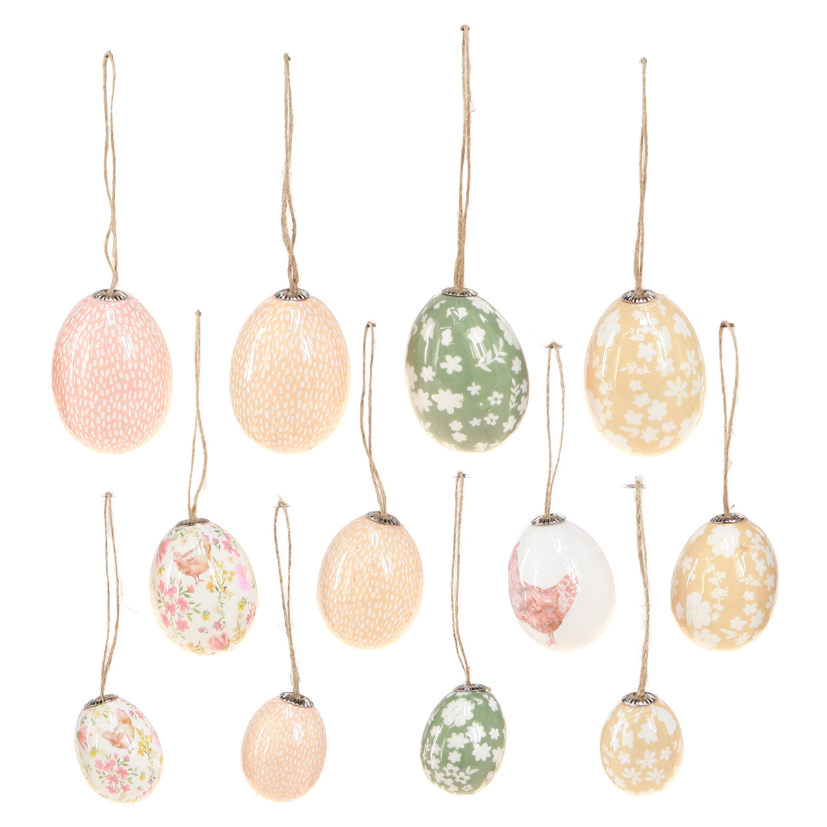 Unsere Ostereier aus Plastik in den frischen Farben Weiß, Grün und Braun sind die perfekte Osterdekoration für Ihr Zuhause. Diese zauberhaften Plastikeier sind nicht nur optisch ein Hingucker, sondern auch äußerst praktisch in der Anwendung. Jedes Ei ist aus einer transparenten Kunststoffhülle gefertigt und im Inneren mit farbigem Papier in Grün und Braun versehen. Das Design wird durch vereinzelt auftretende Huhn-Motive ergänzt, die den ländlichen Charme betonen. Durch die kleinen Ösen aus Metall und die Juteschlaufen lassen sich die Eier unkompliziert aufhängen, sei es am Osterstrauß im Wohnzimmer, am Osterkranz an der Tür oder am Osterstrauch auf dem Balkon. Die zwei Beutel beinhalten jeweils 12 Plastikeier in verschiedenen Größen (3,5–5,5 cm), die für eine abwechslungsreiche und kreative Gestaltung sorgen. Die Kombination von klassischen Ostersymbolen und modernen Materialien macht diese Osterdeko zu einer farbenfrohen Tischdekoration oder zu einer attraktiven Balkongestaltung im Frühling.