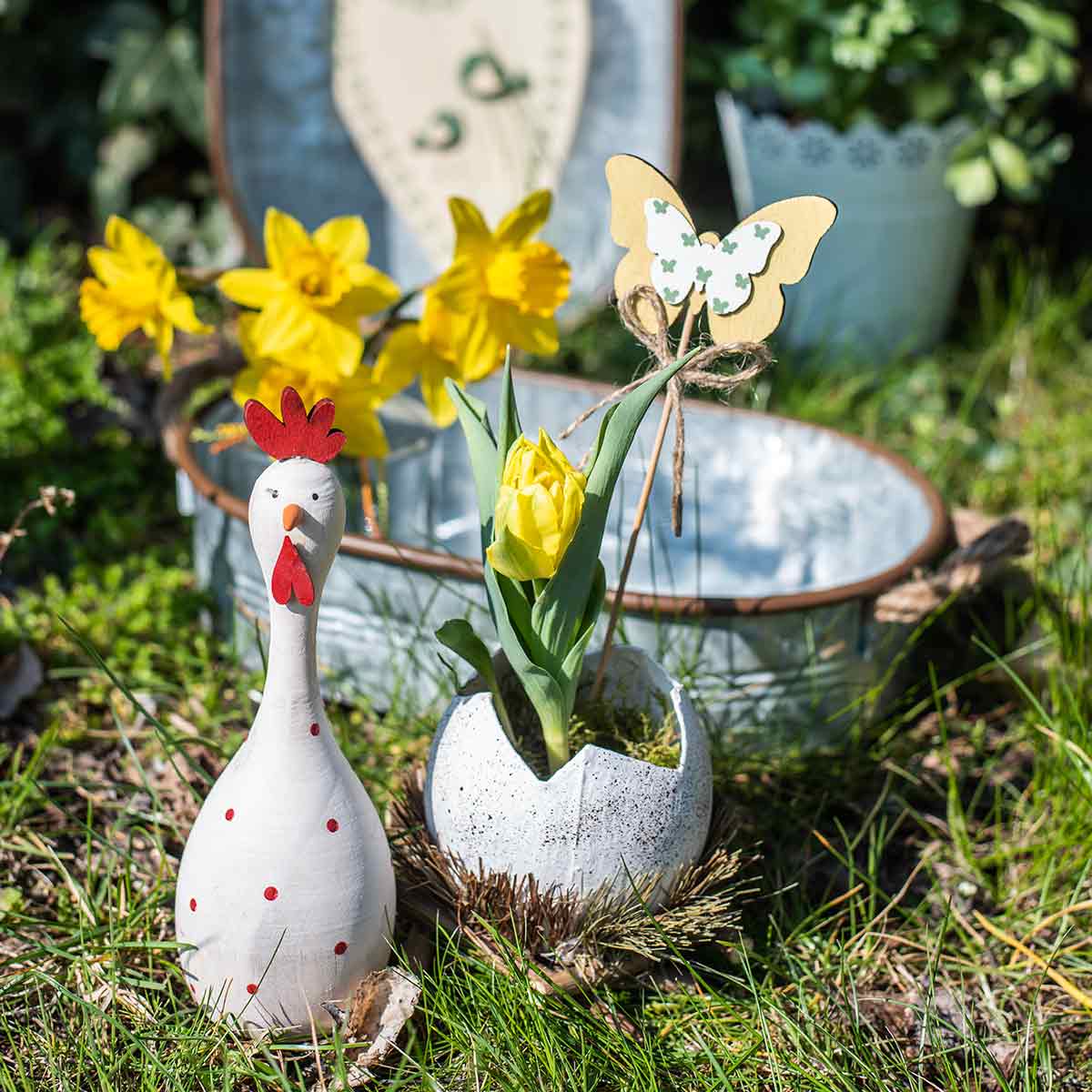Verwendungszweck: Dekorationsartikel für den Frühling, einschließlich Tischdeko, Hänger, Figuren, Gestecke und floristische Materialien.