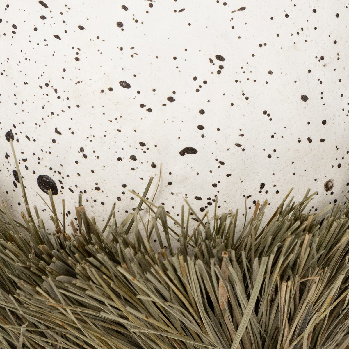 Das weiße Deko-Ei mit braunen Sprenkeln befindet sich in einem Bett aus echtem getrockneten Gras, das sich auf einem Kranz aus kleinen Holzscheiten befindet. – Somit sieht das Ganze nicht nur aus wie ein echtes Vogelnest, das man so in der Natur finden könnte, sondern steht auch sicher und stabil.