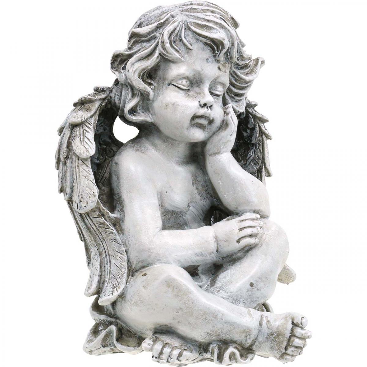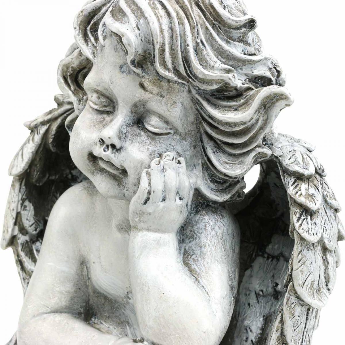 Die Engelfigur mit detailliert gearbeiteten Federflügeln sitzt als Grabdeko mit überkreuzten Beinen da. Der Grabengel schaut mit geschlossenen Augen melancholisch nach unten und hat den Kopf in die flache Hand gestützt.