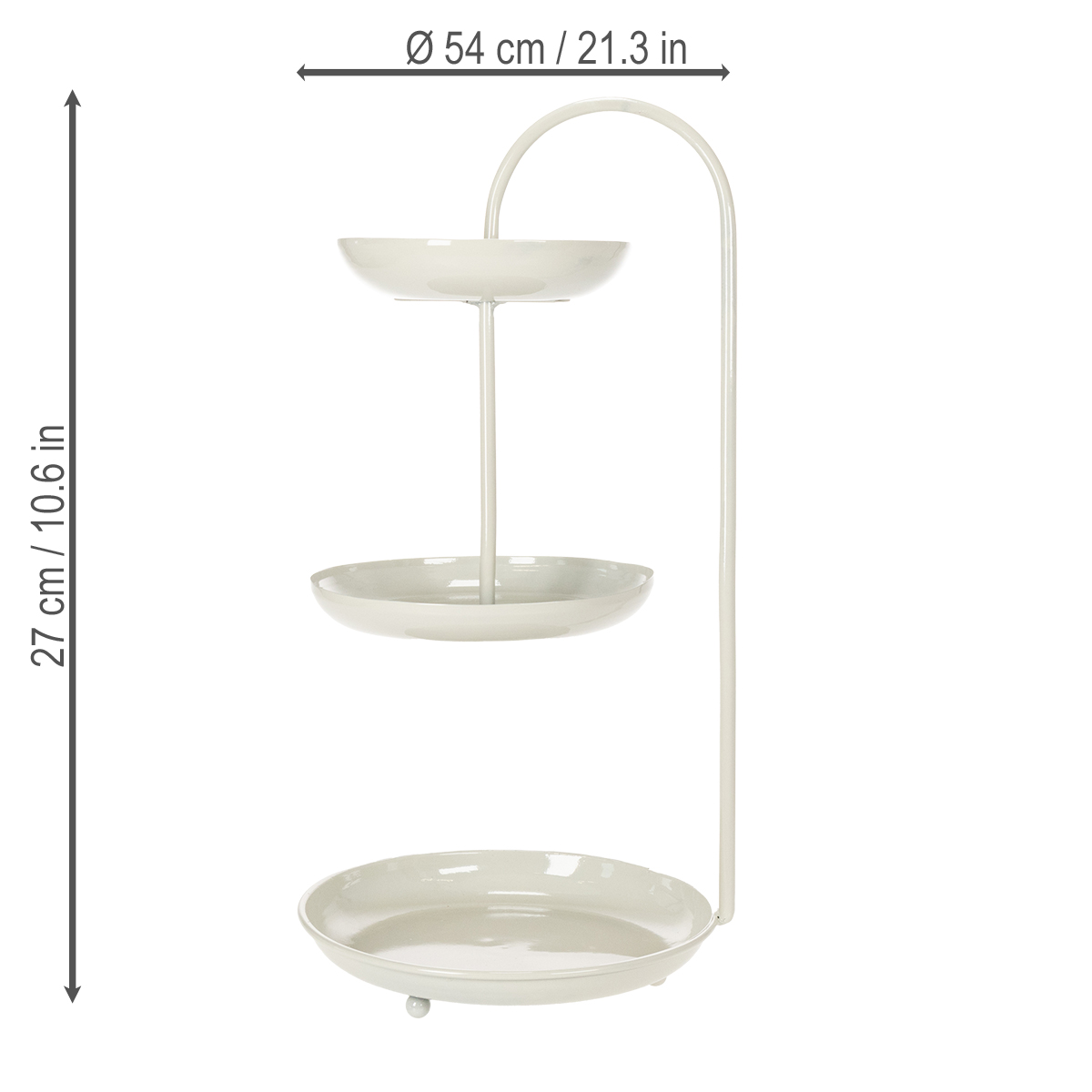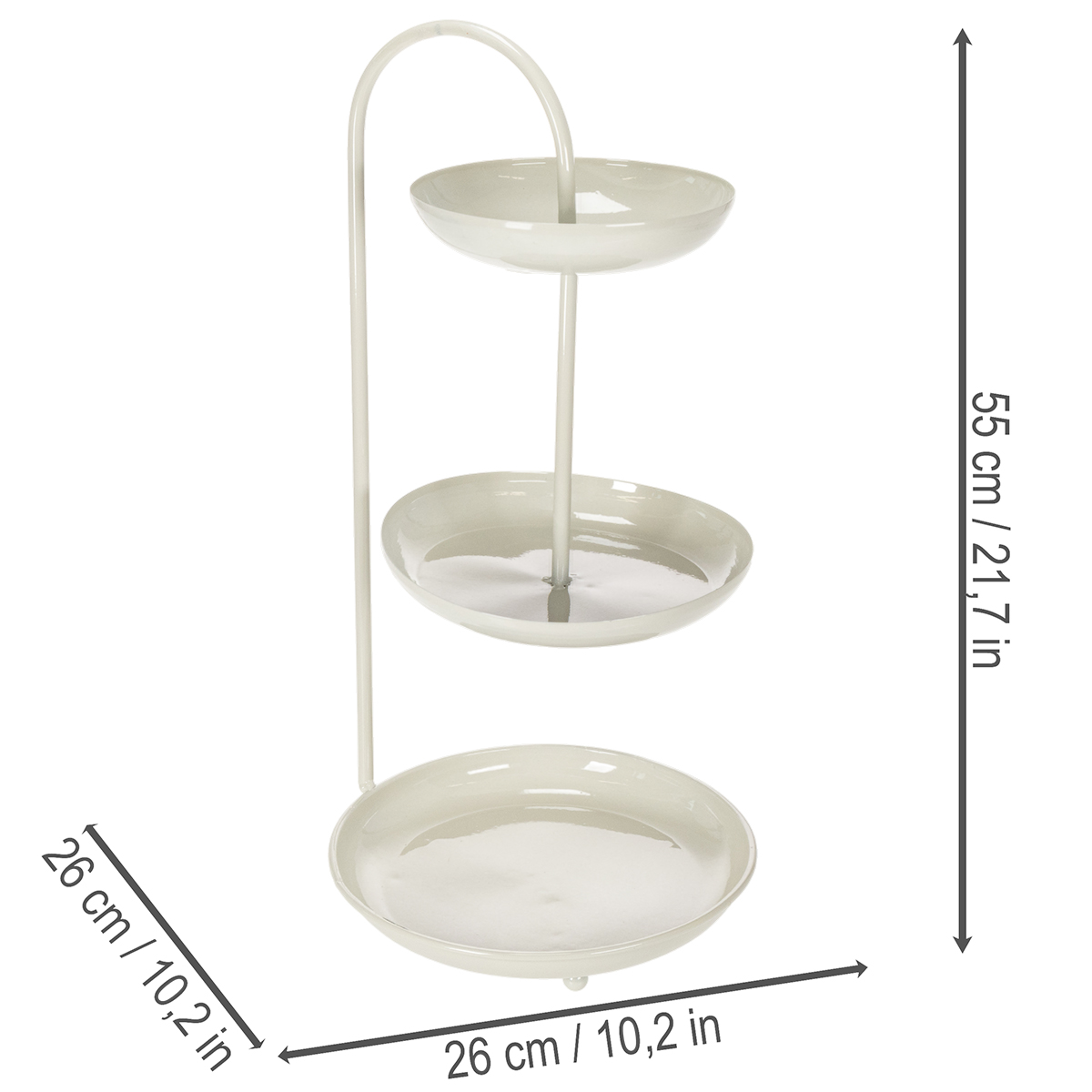 Mit ihrer klaren, modernen Optik passt die dreistöckige Etagere in jeden Raum und verleiht Ihrer Dekoration das gewisse Etwas. Die drei Teller haben unterschiedliche Durchmesser (Ø26 cm, 23 cm und 18 cm) und bieten Platz für verpackte Lebensmittel oder dekorative Elemente. Die neutrale Farbgebung lässt sich spielend leicht mit anderen Deko-Stilen kombinieren – ob Minimalistisch, Skandinavisch oder sogar Boho. Auch praktisch überzeugt die Etagere: Sie ist leicht zu reinigen, platzsparend und stabil zugleich. Perfekt für den Einsatz auf dem Wohnzimmertisch, als Herzstück auf einer Hochzeitstafel oder für thematische Partys! Wichtig zu beachten: Sie ist nicht für unverpackte Lebensmittel geeignet, ideal also für Pralinen, Cupcakes in Förmchen oder dekorative Figuren. Kombinieren Sie die Etagere mit weiteren Floristik24-Artikeln wie einer stilvollen Tischleuchte oder harmonierenden Blumenvasen, um Ihr Ambiente perfekt abzurunden!