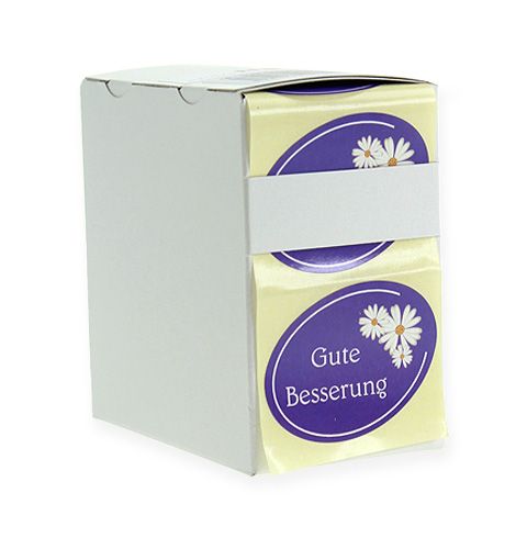 Angeboten werden die lilafarbenen, selbstklebenden Etiketten mit der weißen Aufschrift „Gute Besserung“ in einer praktischen 250er-Box, die zugleich als Spender fungiert. Die circa 5,5 x 4 Zentimeter großen Aufkleber befinden sich auf einem Band und können bei Bedarf ganz einfach abgezogen werden.