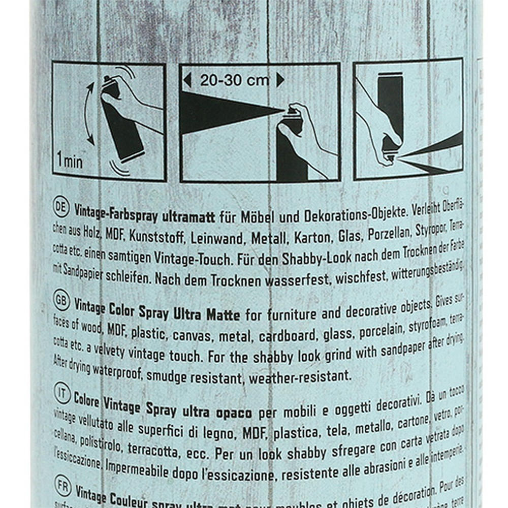 Dieses hellblaue Farbspray „Vintage“ erinnert an den schönsten Frühlings- oder Sommerhimmel und eignet sich so zur Umsetzung vieler kreativer Gestaltungs- und Dekoideen. Ob Sie die umweltfreundliche Sprühfarbe nun auf Leinwand, Metall, Holz, Porzellan oder Karton anwenden, spielt dabei keine Rolle – diese und noch viele andere Materialien sind mit dem Color-Spray kompatibel, sodass Ihrer Fantasie keinerlei Grenzen gesetzt sind!