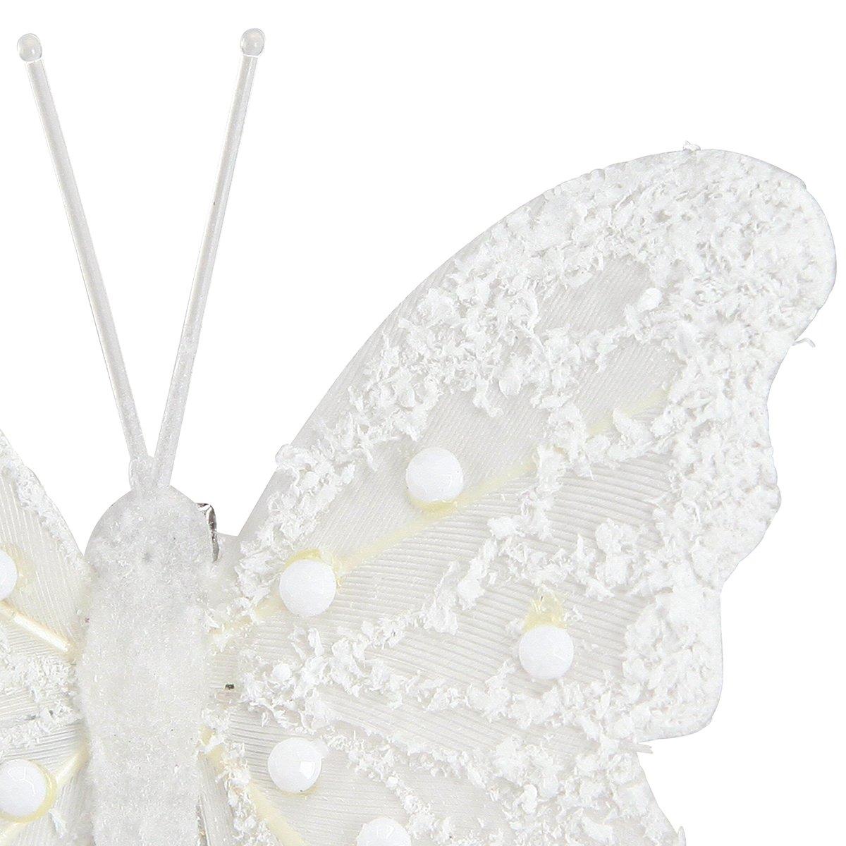 Verzaubern Sie Ihre Gestecke und Kränze mit dieser bezaubernden Schmetterling-Deko am Clip in strahlendem Weiß. Die zarten Flügel, verziert mit weißen Flocken und Perlen, bringen den Charme des Frühlings in Ihr Heim.