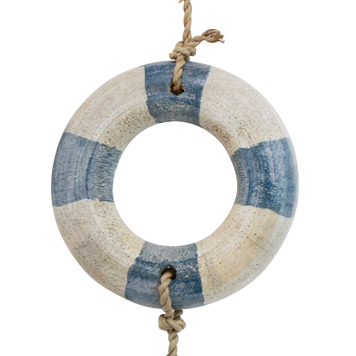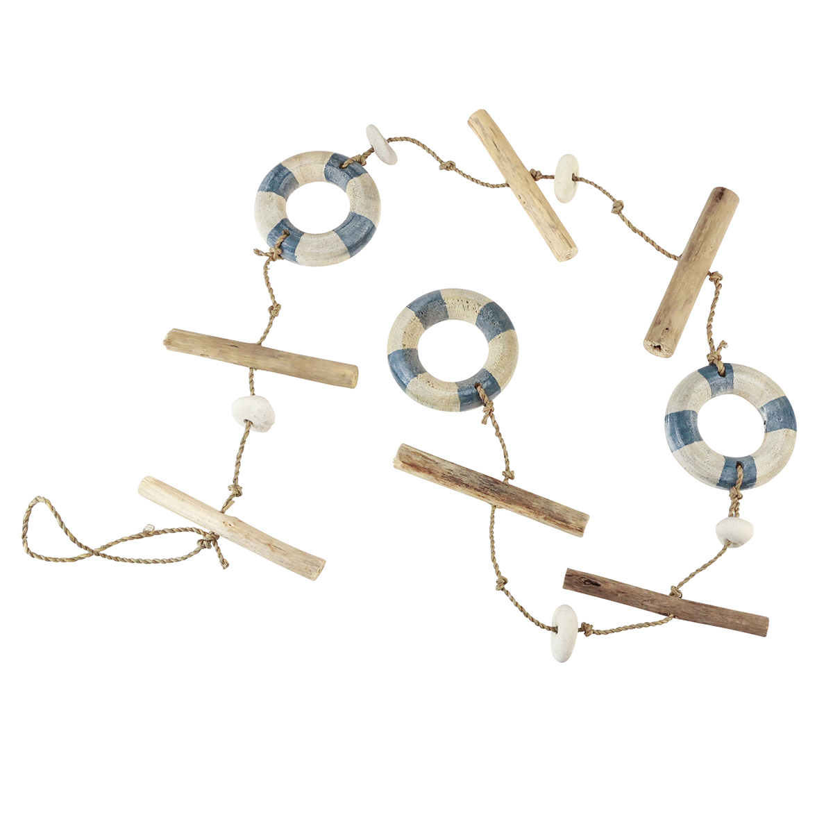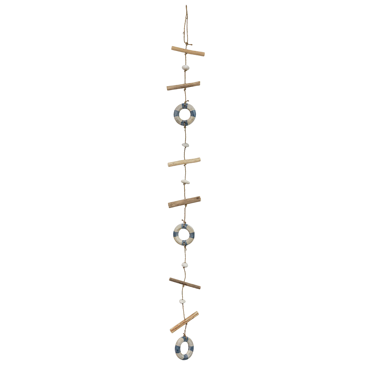 Weiße Kiesel und Treibholzstücke runden das Design der maritimen Hängedeko ab. Die Rettungsringe wirken etwas ausgewaschen und passen gut zu Shabby Chic. Der Hänger wird durch eine Kordel aus geflochtener Naturfaser zusammengehalten.