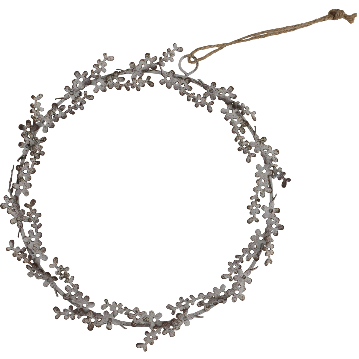Die weiße Farbe der Metall-Deko ist mit einem dezenten Rost- und Alterungseffekt versehen. Diese aufwändige Behandlung verleiht dem Blumenkranz eine charmante Patina.
