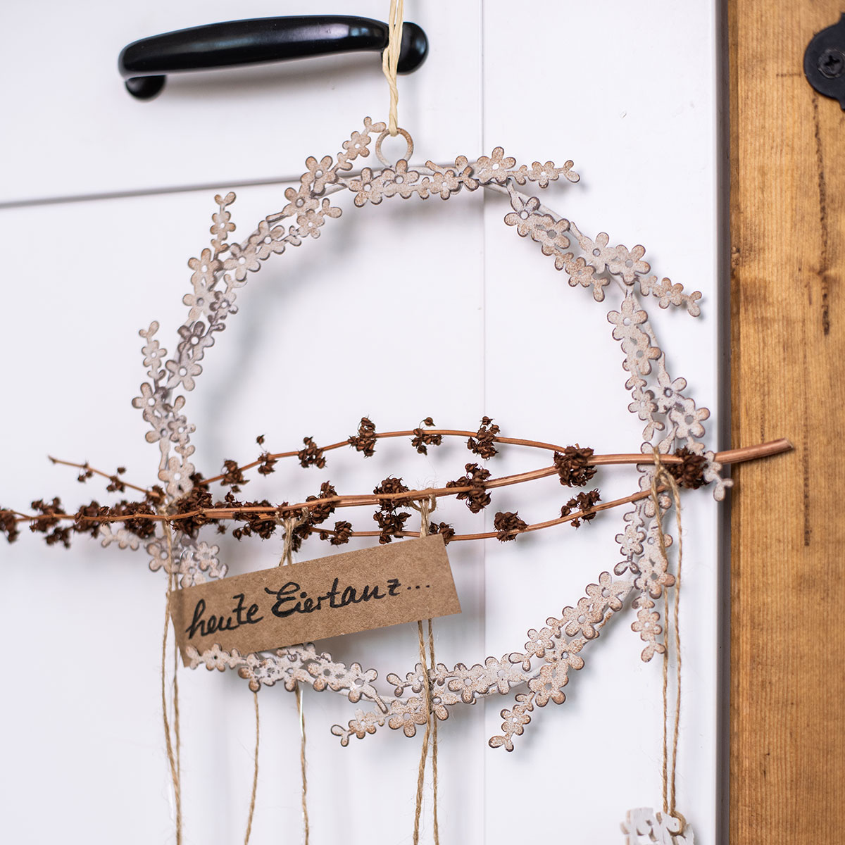 Platzieren Sie den Kranz als Highlight an einem Türkranz. Der Metall-Blumenkranz eignet sich besonders gut für die Osterdeko und für Dekorationen in Weiß sowie für weiß gewaschene Holzdeko oder Dekorationen in zarten Pastellfarben.