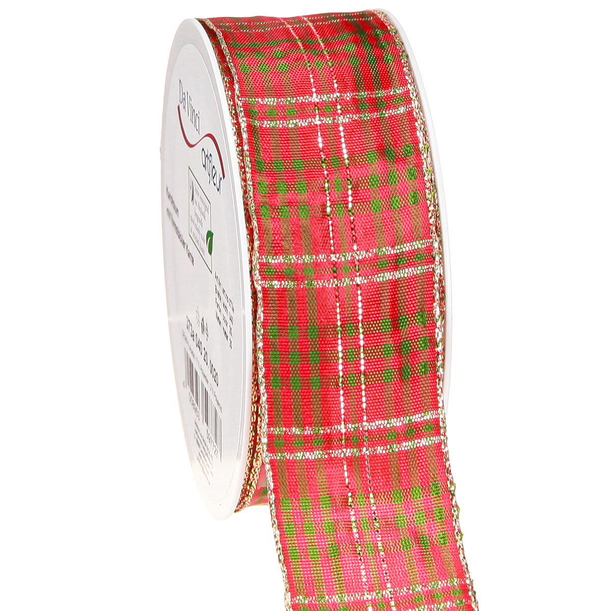 Produktname: Festliches kariertes Geschenkband Rot Grün Gold 40mm 20m