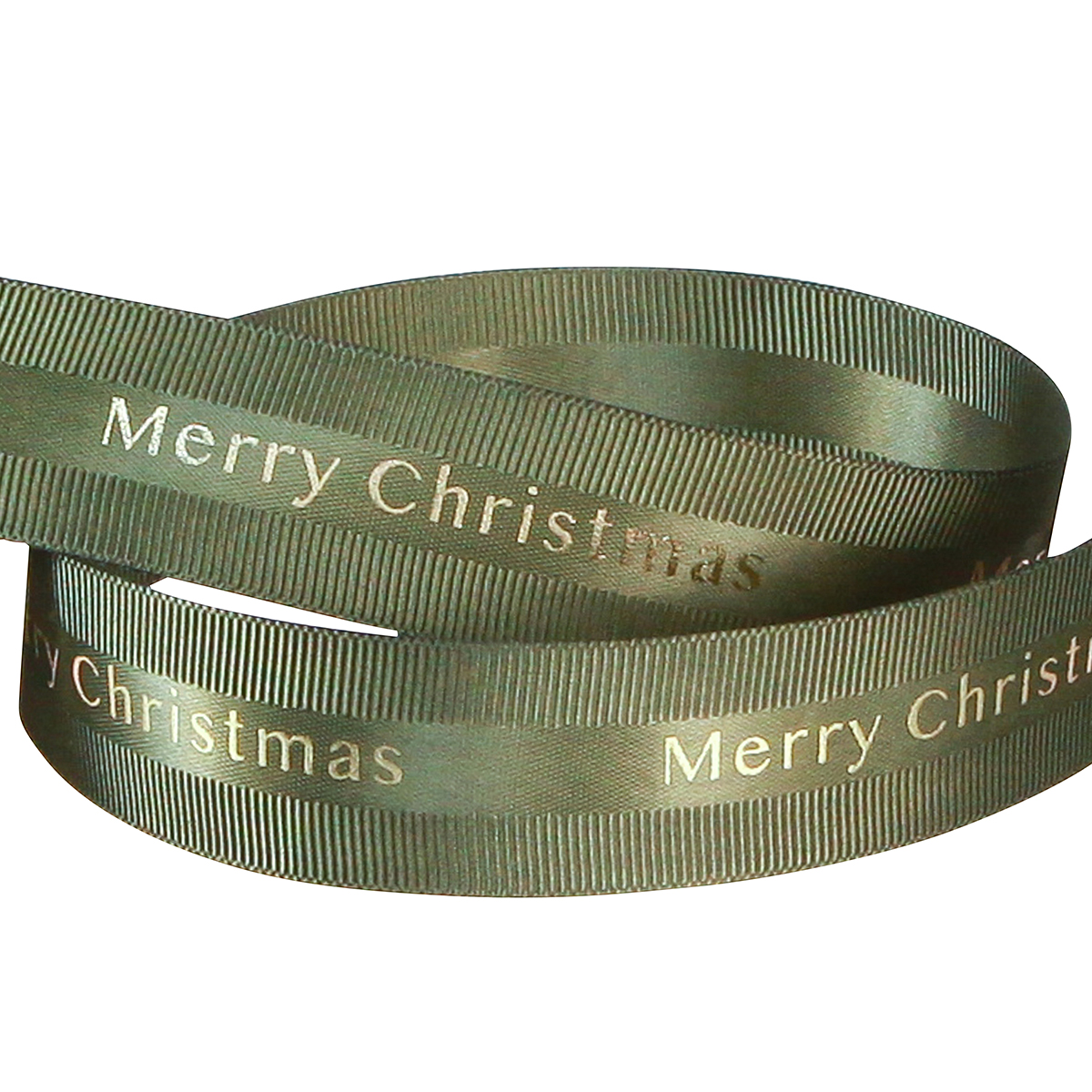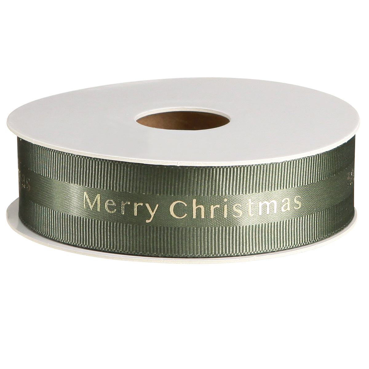 Festliches Weihnachtsband in Dunkelgrün mit goldenem 'Merry Christmas' Schriftzug Breit 25mm Länge 20m
