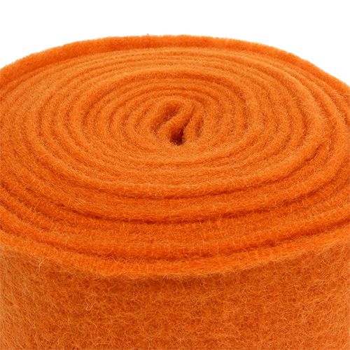 Das Filzband in Orange ist zu einer Rolle gewickelt und hat eine Länge von ungefähr 5 Metern. Die Breite des Bandes beträgt in etwa 15 Zentimeter, wodurch das Band sehr gut für mittelgroße Töpfe geeignet ist und genug Fläche für Figuren zum Ausschneiden bietet.