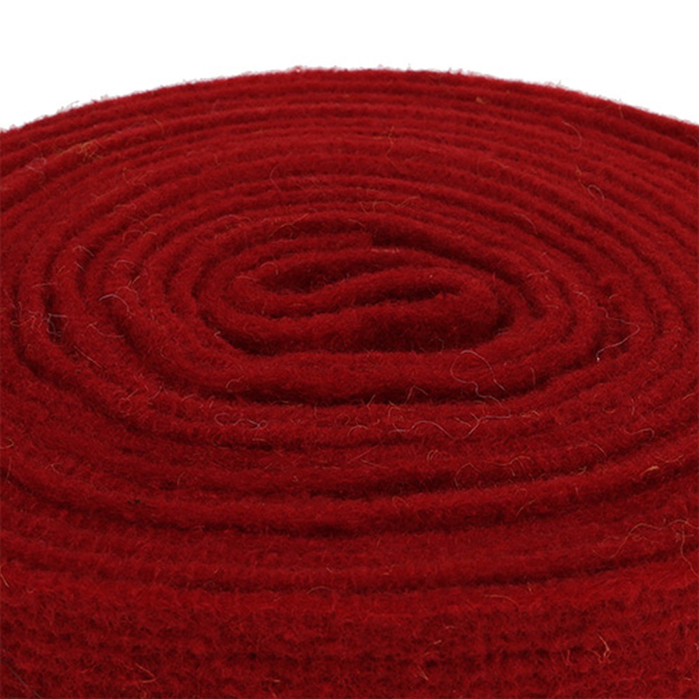 Das rote Filzband ist zusammengerollt und besitzt eine Breite von circa 7,5 Zentimetern und eine Gesamtlänge von ungefähr 5 Metern. Es kann unter anderem auch als origineller Tischläufer und zum Kreieren einer natürlichen Dekoration für Schaufenster und Empfangstresen eingesetzt werden.