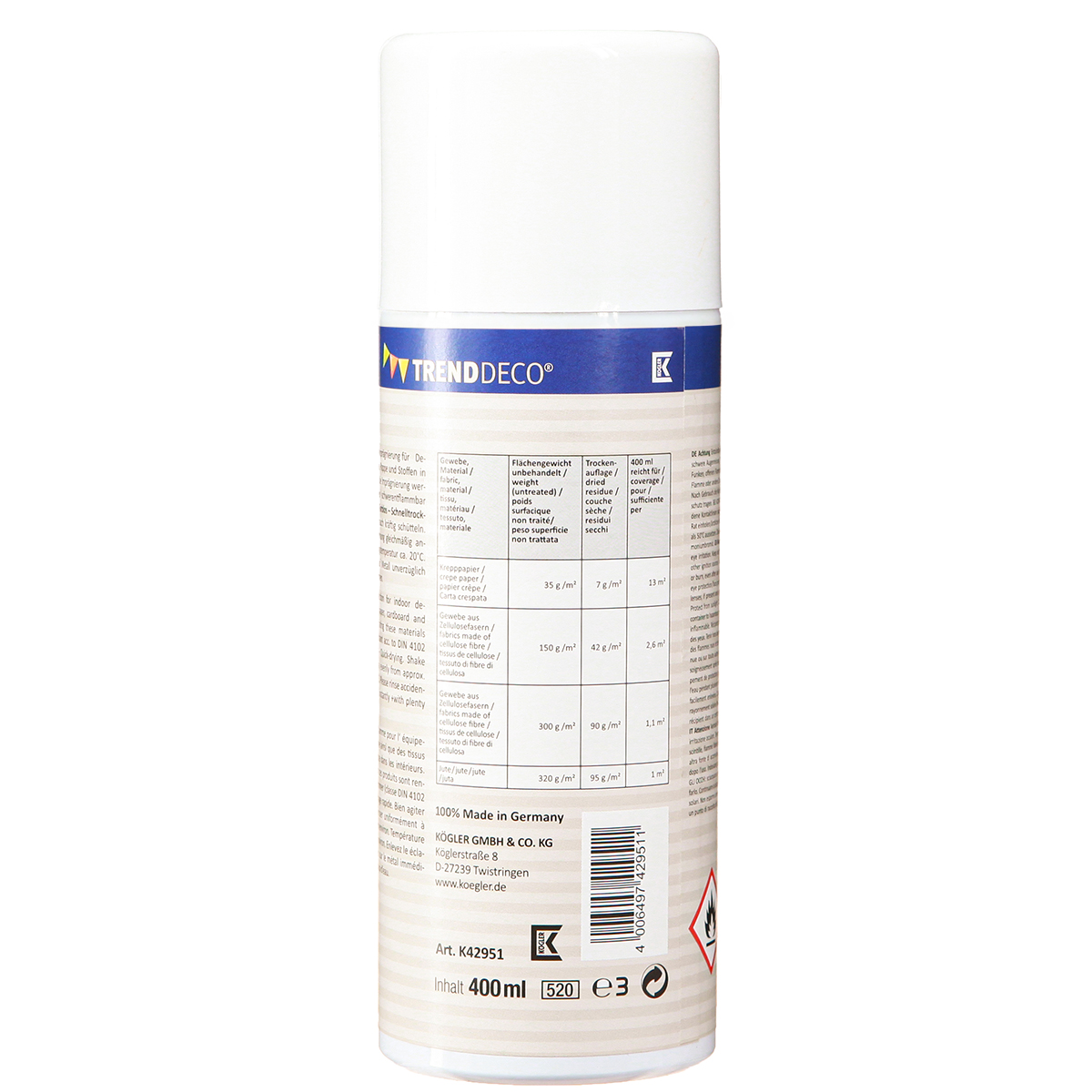 Das Flammenschutzspray wird in einer Sprühdose zu insgesamt 400 Milliliter geliefert. Die Dose steht unter Druck und sollte dementsprechend vorsichtig behandelt werden. Vor Gebrauch sollten Sie sie ordentlich schütteln.