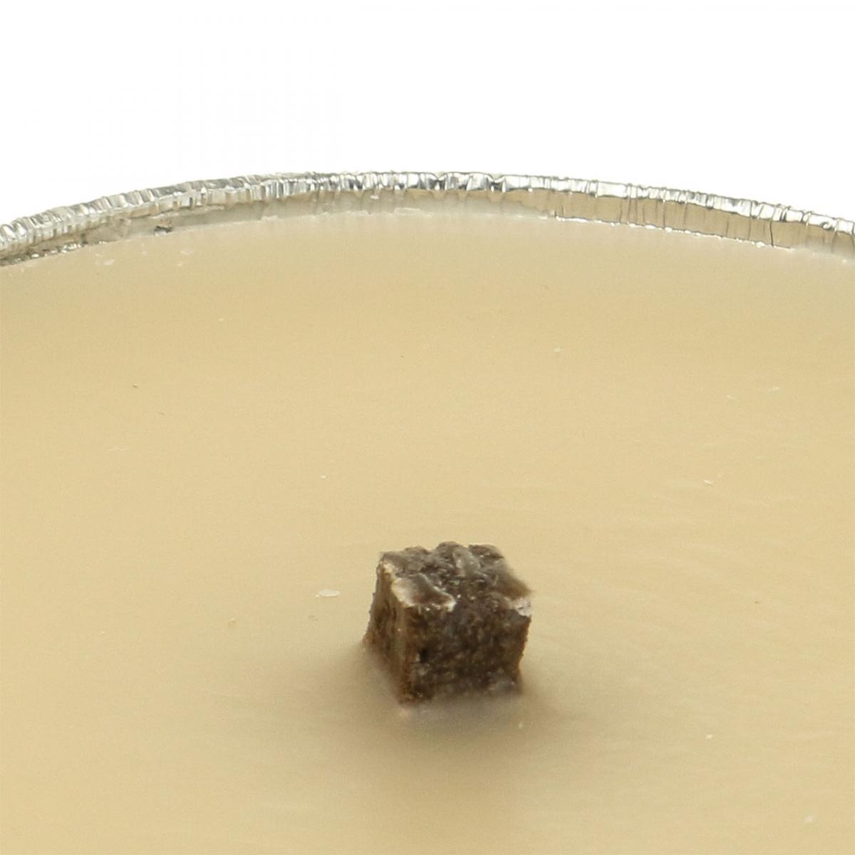 Die Flammschale in Wachsfarben in einer Aluform hat einen Durchmesser von ungefähr 17 Zentimetern. Die Höhe beträgen etwa 2,5 Zentimeter und die Brenndauer circa 4 Stunden.