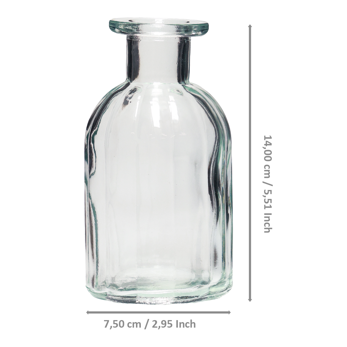 Bei uns im Shop finden Sie die Flaschenvase auch noch in einer größeren Ausführung. Die Glasvasen-Deko in klein ist etwa 14 Zentimeter hoch und besitzt einen Durchmesser von um die 7,5 Zentimetern.