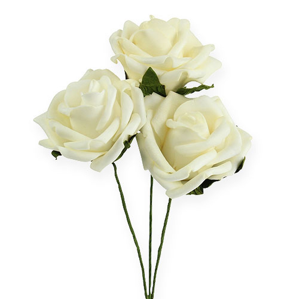 In einer Verpackungseinheit befinden sich 27 einzelne Foam-Rosen in Creme und jede hat mit dem Biegedraht, der mit grünem Papier umwickelt ist, eine Länge von etwa 21 Zentimetern. Der Durchmesser der Rosenköpfe beträgt jeweils circa 6 Zentimeter bei einer Breite von etwa 3,5 Zentimetern.