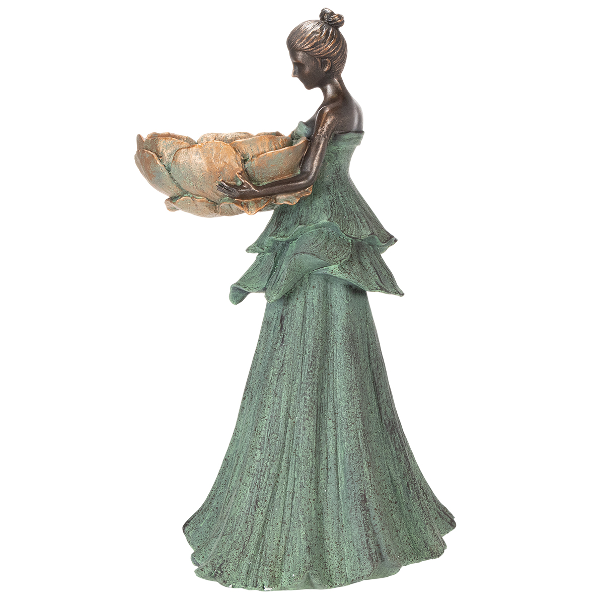 Sind Sie auf der Suche nach einem einzigartigen Hingucker für Ihr Zuhause oder Ihren Garten? Diese dekorative Frauenstatue mit Blumenschale vereint kunstvolle Eleganz mit praktischer Funktionalität. Ob im Wohnzimmer, auf der Terrasse oder mitten in Ihrem grünen Paradies – diese Statue fügt sich harmonisch in nahezu jeden Einrichtungsstil ein. Ihr charmantes Design in zeitloser, grüner Farbgebung und ihre lebendigen Details lassen nicht nur Kunstliebhaber ins Schwärmen geraten. Sie möchten Ihrem Garten oder Ihrer Wohnung mehr Persönlichkeit verleihen? Dann ist diese 55 cm hohe Frauenstatue genau das richtige Statement-Piece!