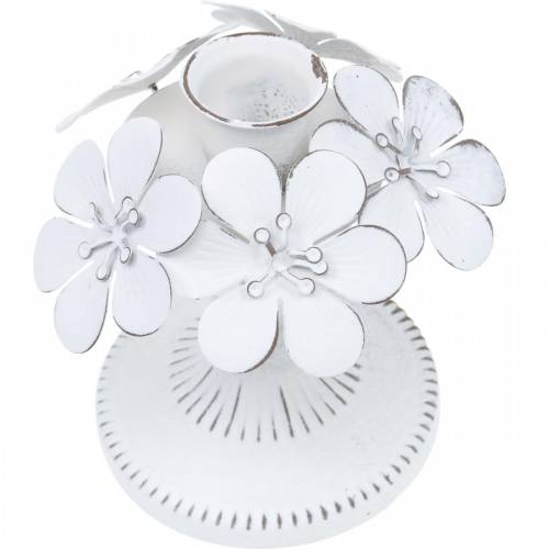 Vervollständigen Sie Ihre Frühlingsdeko mit einem Metall-Leuchter mit Blumen oder geben Sie der Tischdeko für eine Hochzeit den letzten Schliff mit floralen Kerzenhaltern in antikem Weiß im beliebten Shabby Chic.Die Kerzendeko hat einen großen stabilen Standfuß der rundum mit dekorativen Rillen verziert ist. Von dort aus gehen schmale Blumenstängel nach oben welche um die eigentliche Halterung für die Kerze in fünf stilisierte Blüten übergehen. Die Metallblumen des Kerzenhalters erinnern an Vintage-Objekte des Jugendstils und werden so zum Hingucker Ihrer festlichen Tischdeko. Die Kanten sind etwas abgeschliffen wodurch der charmante Vintage-Effekt erzeugt wird.