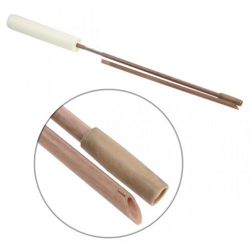 Als Gartendeko leuchtet die LED-Solar-Kerze stimmungsvoll aus dem Gebüsch. Die Solarleuchte hat die Form einer Kerze auf einem langen hellbraunen Stab aus Kunststoff. Die LED-Birne ist der Form einer Kerzenflamme detailliert nachempfunden.