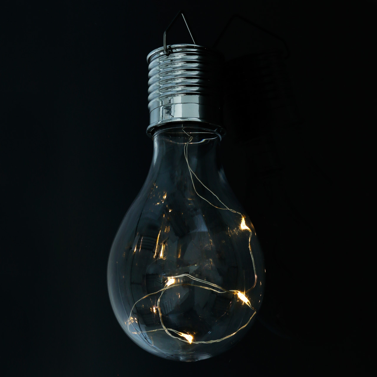 So verzaubern Sie nicht nur sich selbst, sondern auch Ihre Gäste beim Sommerfest oder der Gartenparty mit leuchtender Deko. Egal, ob Sie die Solarleuchte malerisch von blühenden Bäumen hängen lassen, an einer Schnur wie Lampions aufhängen oder Sie sogar dekorativ auf dem Büffet verteilen – Ihr Event erstrahlt so im besten LED-Licht! Die Solar-Gartenleuchte im Glühbirnen-Stil und mit 4 warmweißen LEDs hat eine Höhe von circa 15 Zentimetern, etwa 16,5 Zentimetern mit dem Aufhänger. Der Durchmesser beträgt dabei ungefähr 8 Zentimeter.