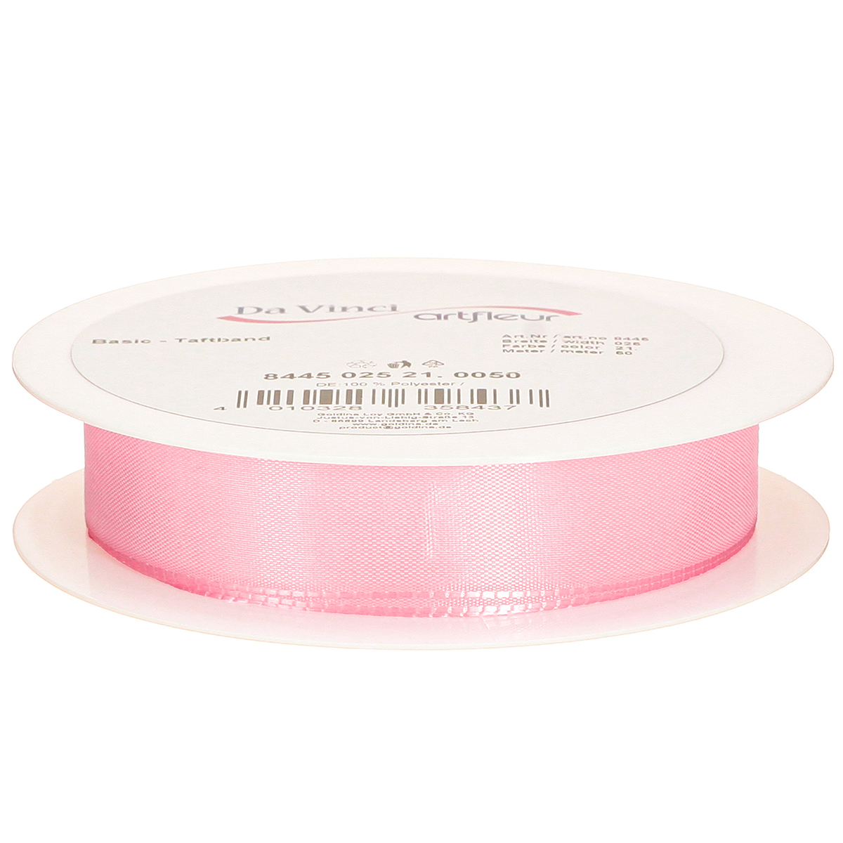 Das Geschenk- und Dekorationsband in Hellrosa ist etwa 25 Millimeter breit und ungefähr 50 Meter lang. Es ist zu 100% aus Polyester gefertigt und auf einer handlichen Kunststoff-Spule aufgewickelt.