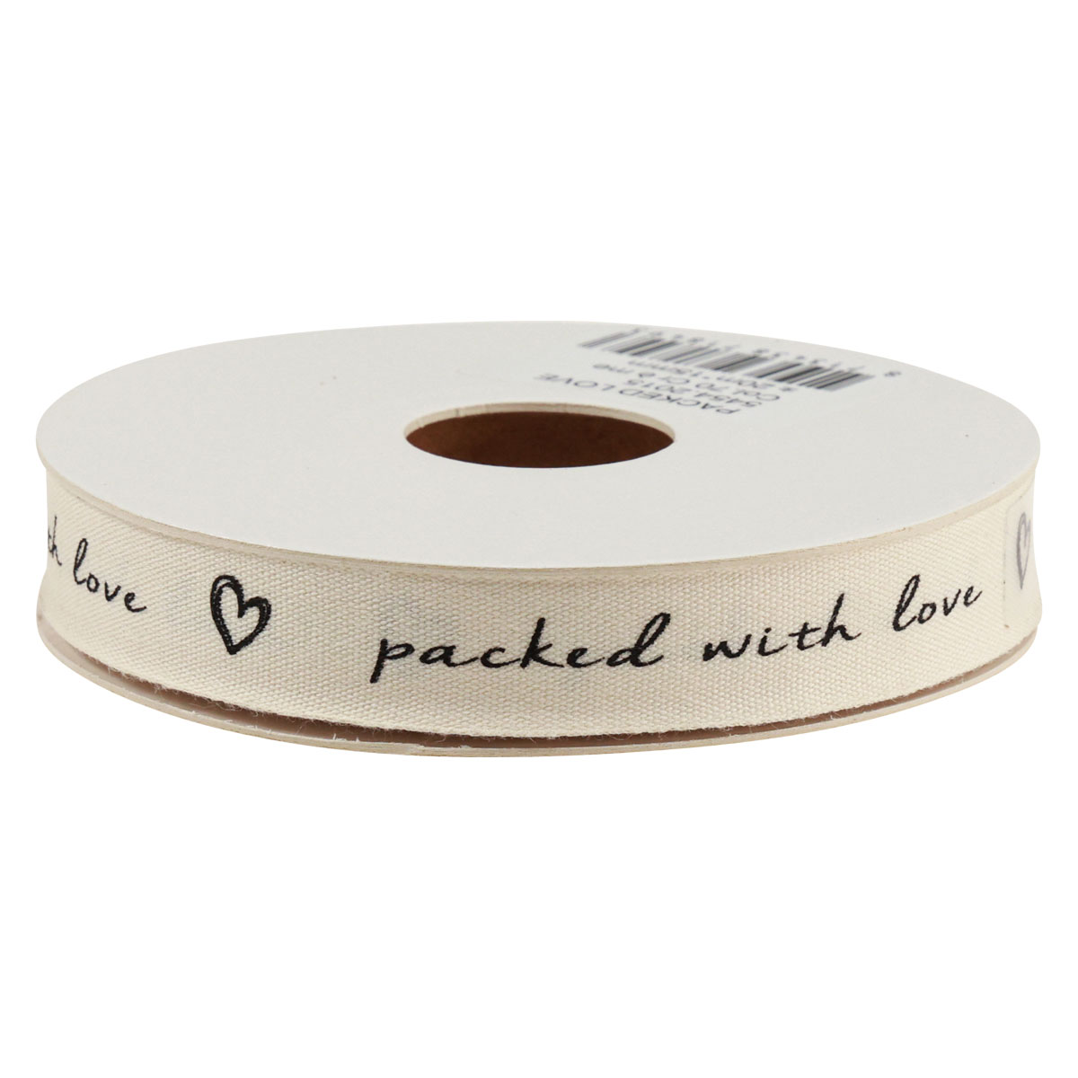 Das Band aus reiner, cremefarbener Baumwolle ist mit der Aufschrift „packed with love“ und Herzen bedruckt und überbringt damit den Beschenkten auf jeden Fall die Botschaft, dass Ihr Geschenk von Herzen kommt. Das Geschenkband befindet sich auf einer Spule aus Karton, die wie das Band selbst biologisch abbaubar ist. So gelingt nachhaltige Deko!