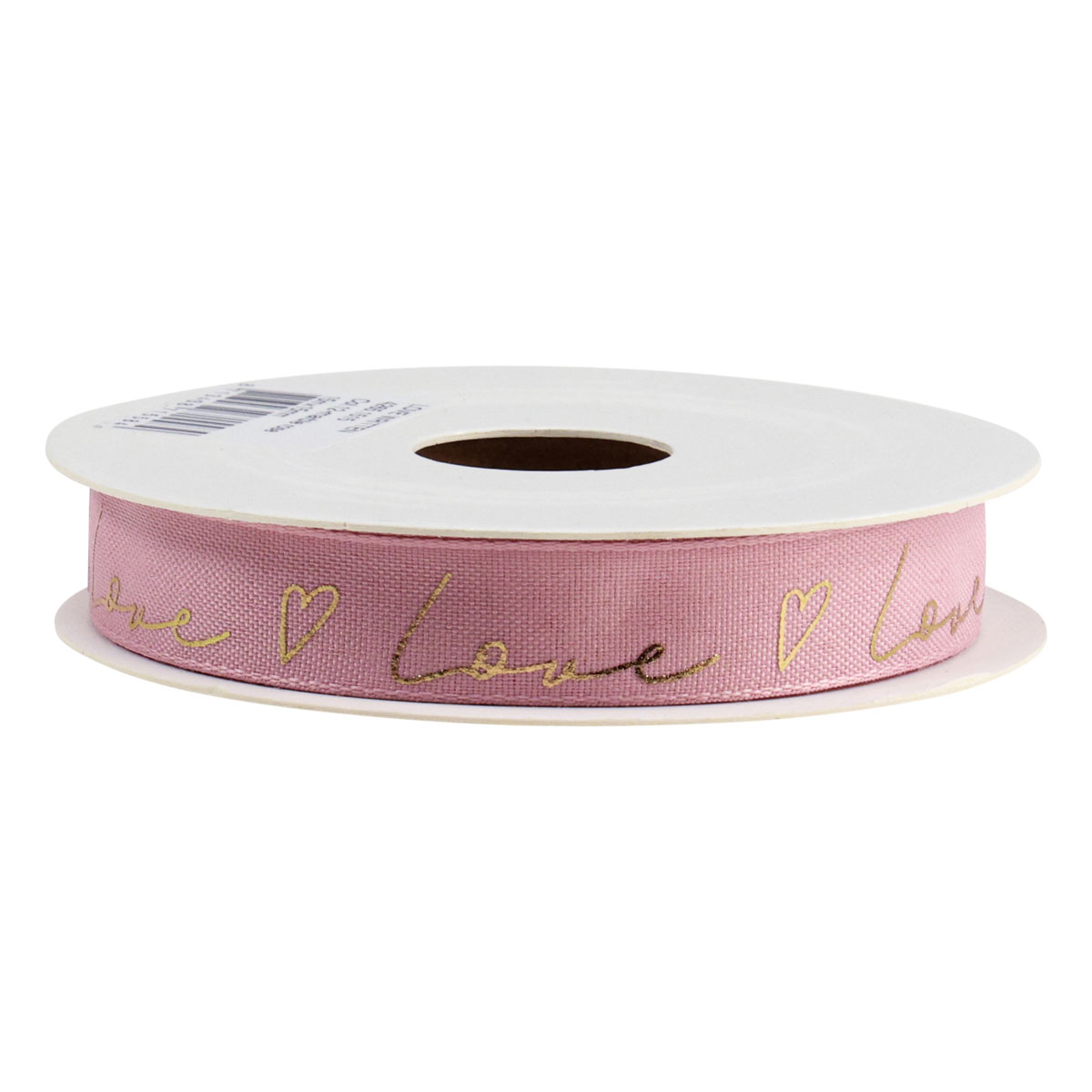 Das Stoffband besteht aus Polyester in einem sehr zarten Rosa und ist mit dem Wort „Love“ und den Umrissen goldener Herzen bedruckt. Durch die Webkanten kann das Dekoband nicht ausfransen.
