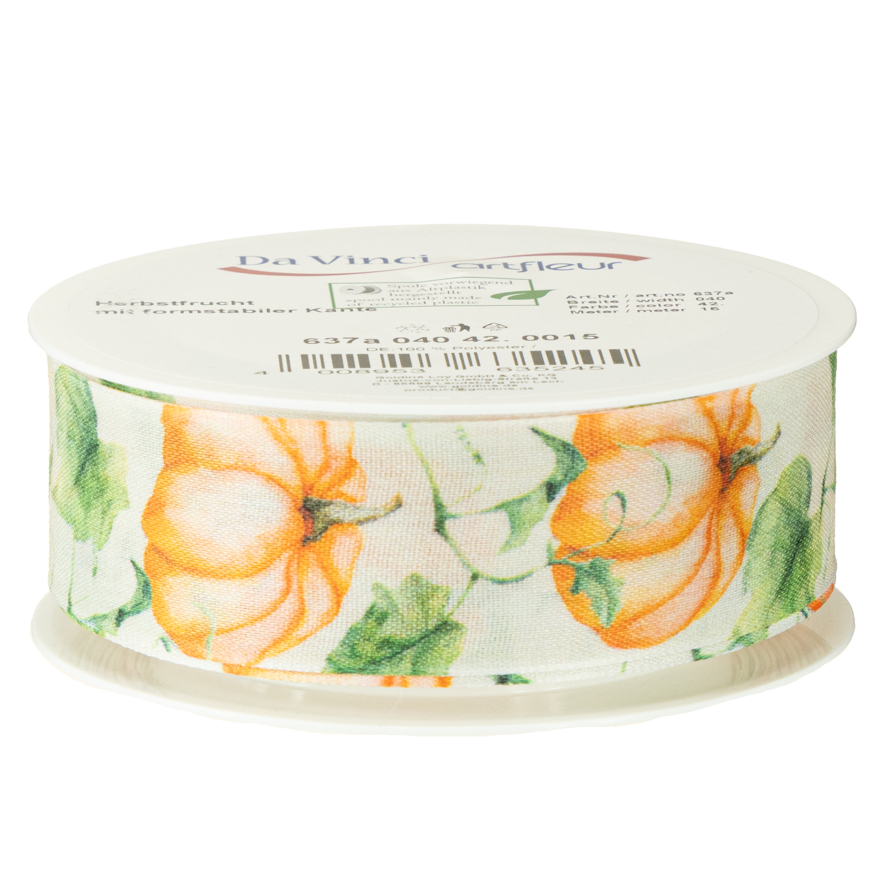 Das Schleifenband ist mit einem detailreichen Kürbis-Motiv bedruckt. Um die orange Herbstfrucht sind Blätter und Ranken pittoresk angeordnet. Das Dekoband erweist sich außerdem durch die formstabile Webkante als Qualitätsprodukt.