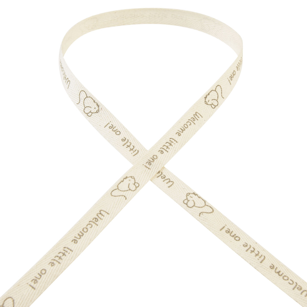 Auf das cremefarbene Band aus reiner Baumwolle sind in hellem Braun neugierige Mäuse und der Gruß „Welcome little one!“ gedruckt. Das Dekoband aus dem Naturmaterial Baumwolle ist biologisch abbaubar und befindet sich für mehr Nachhaltigkeit auf einer Spule aus Karton. So kommt die Deko zur Taufe ganz ohne Kunststoff aus.