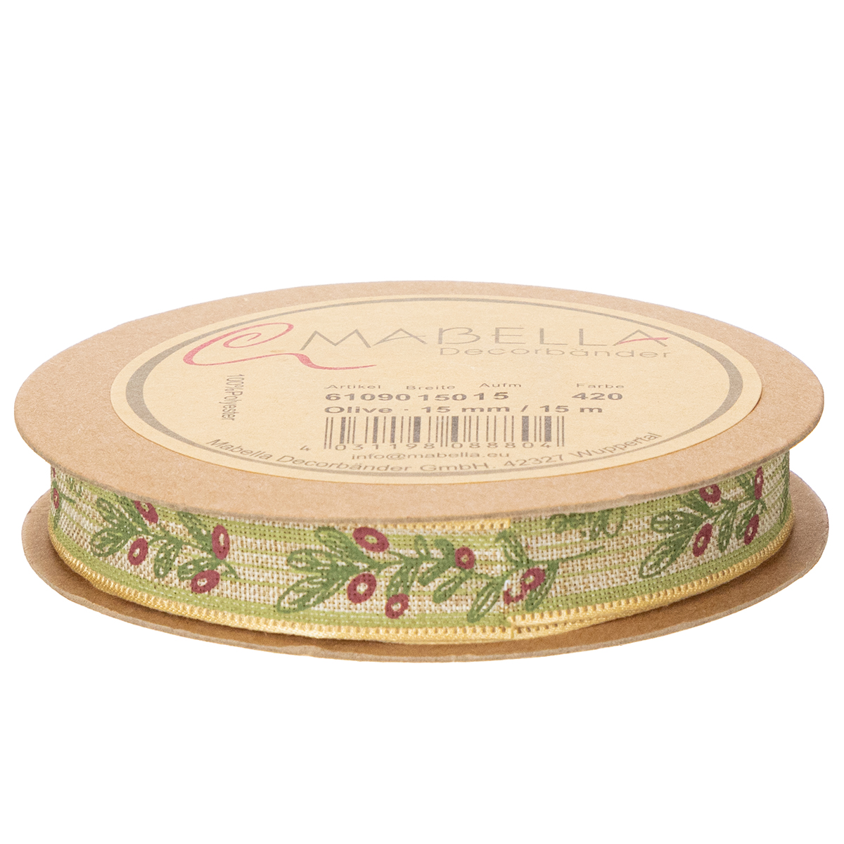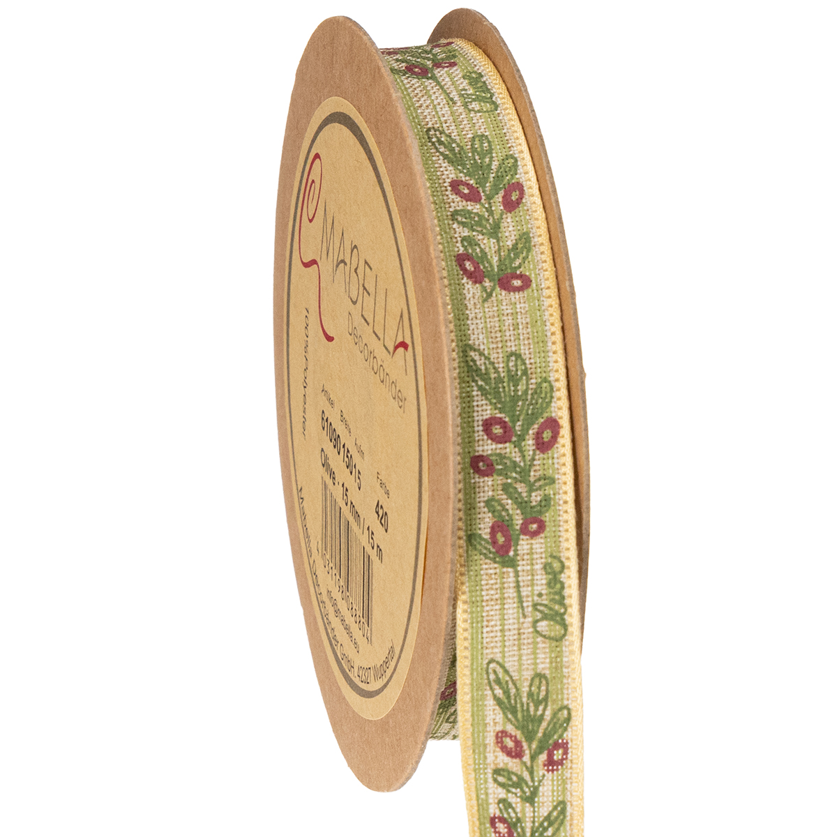 Geschenkband Olivenzweig mit eleganten Zweigen und Oliven 1,5cm 15m
